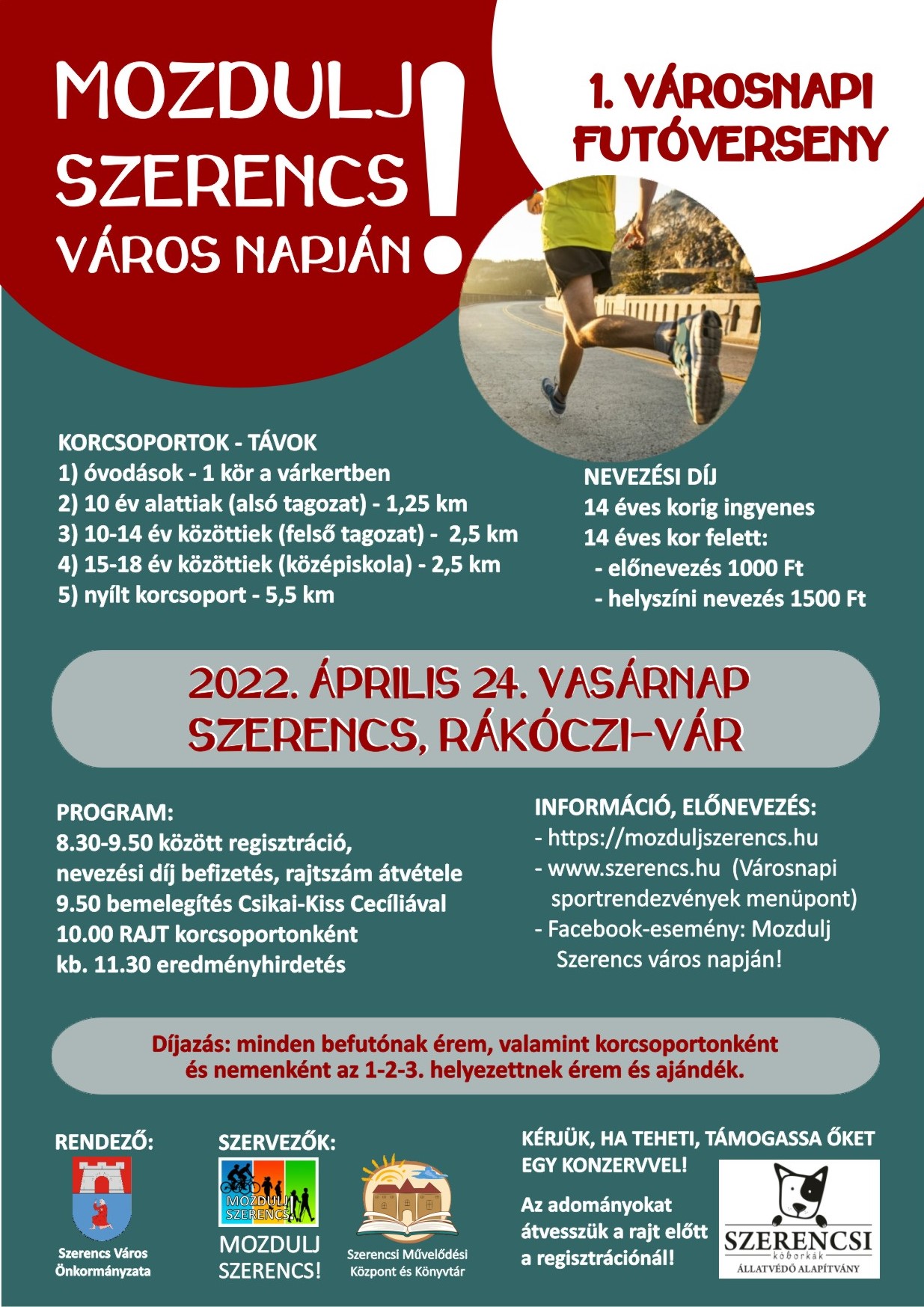 Szerencs Város Önkormányzata, a „Mozdulj Szerencs!” Facebook-csoport, valamint a Szerencsi Művelődési Központ és Könyvtár megrendezi a „Mozdulj Szerencs város napján!” 1. Városnapi Futóversenyt.
