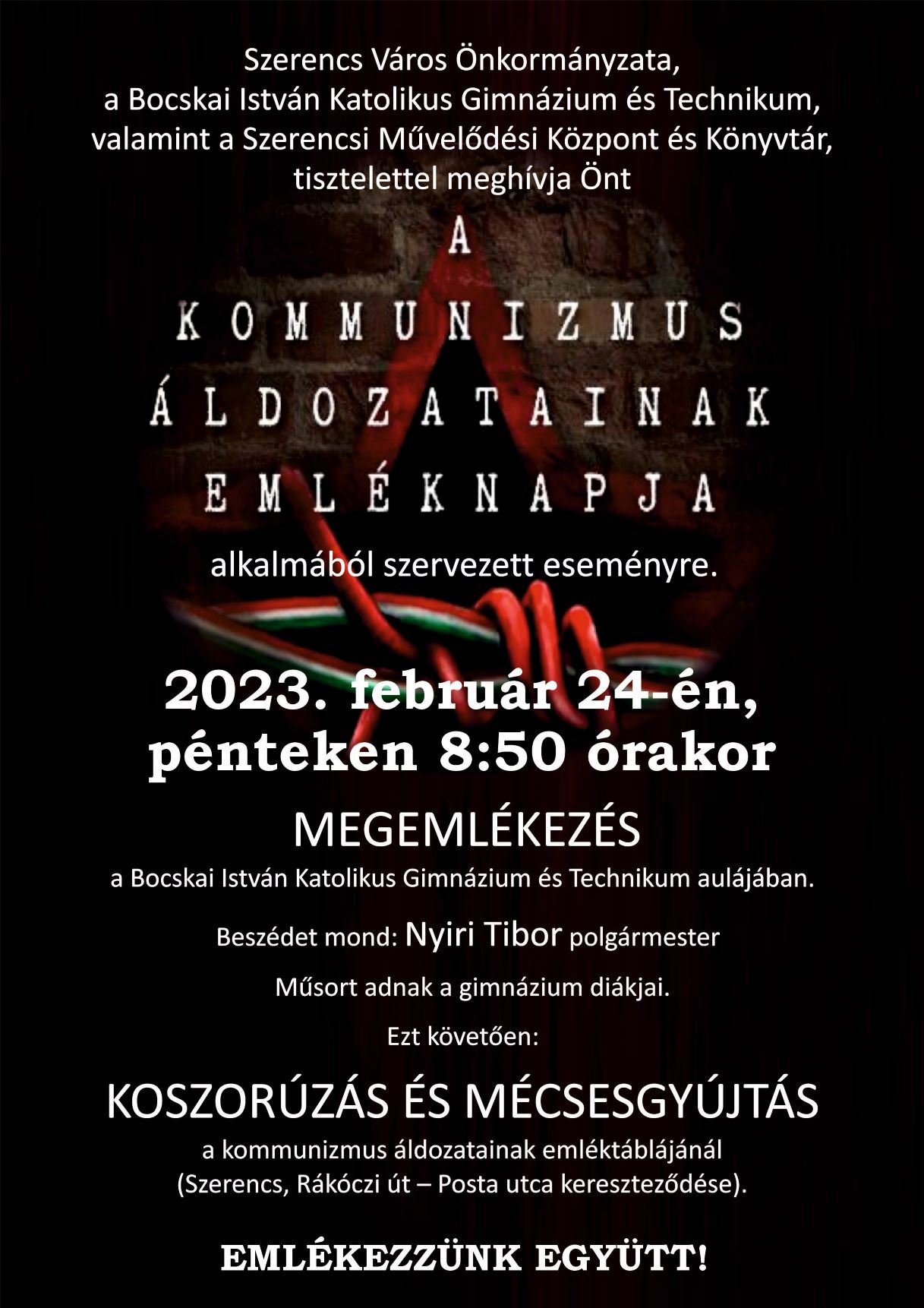 A kommunizmus áldozataira emlékeznek 2023. február 24-én, pénteken délelőtt 8.50 órától a Bocskai gimnázium aulájában, majd koszorúzásra kerül sor a Rákóczi út-Posta utca kereszteződésénél elhelyezett emléktáblánál. Minden megemlékezőt szeretettel várnak!