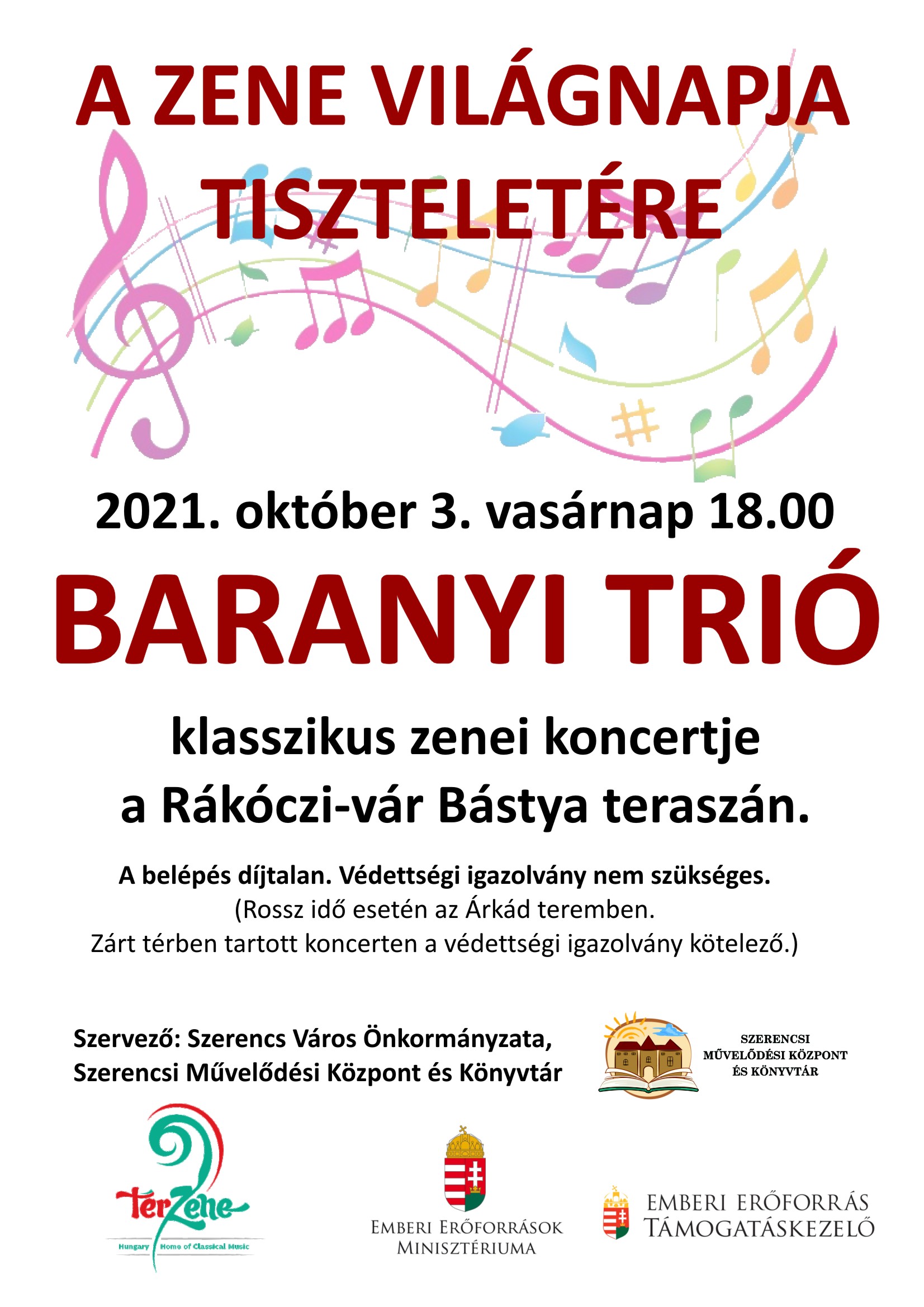A „Térzene koncertek Szerencsen” sorozat részeként a klasszikus zenét játszó Baranyi Trió lép fel a szerencsi Rákóczi-várban 2021. október 3-án, vasárnap 18 órától. A koncerttel egyúttal a zene világnapja előtt is tisztelegnek, amelyet 1975 óta október 1-jén ünnepelnek szerte a világon.