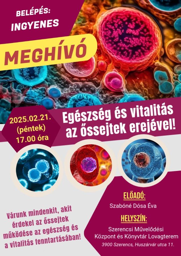 Az előadás során megismerkedhetnek az őssejtek működésével, valamint azzal, hogyan járulhatnak hozzá az egészség és a vitalitás fenntartásához. Várnak mindenkit, aki érdeklődik az őssejtek tudománya iránt!