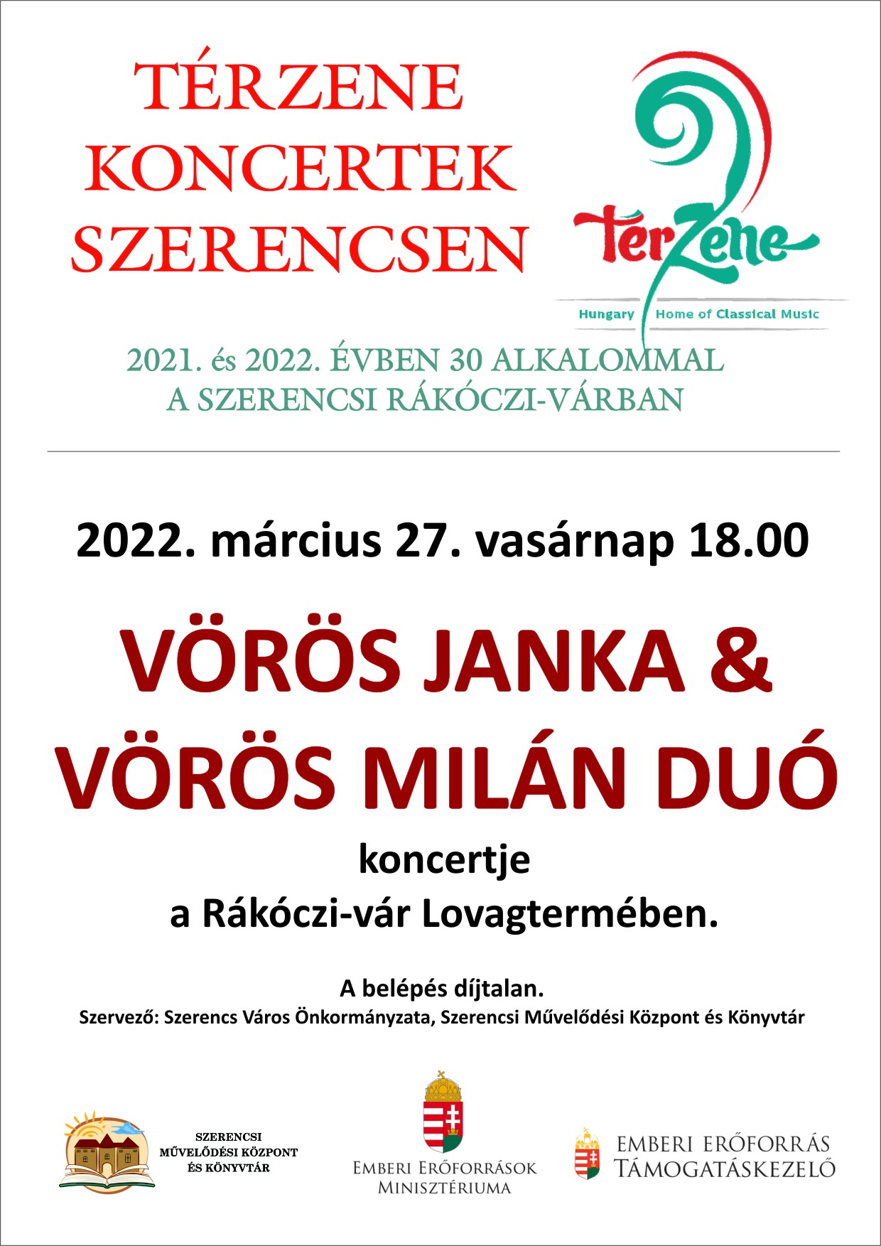 A 2021-ben elnyert pályázati támogatásnak köszönhetően idén tavasszal újabb 15 koncerttel folytatódik térzene sorozatunk. Március 27-étől vasárnap délutánonként a Rákóczi-várba várjuk egy könnyed zenés kikapcsolódásra a jazz és a klasszikus zene rajongóit. A belépés díjtalan.