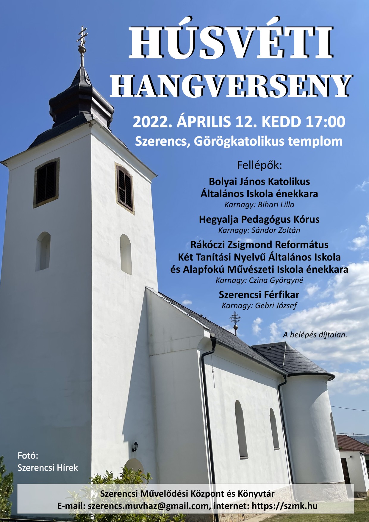 A görögkatolikus gyülekezet,a Szerencsi Művelődési Központ és Könyvtár mindenkit szeretettel vár az idei húsvéti hangversenyre. Ideje: 2022. április 12. kedd 17 óra. Helyszín: Görögkatolikus templom.