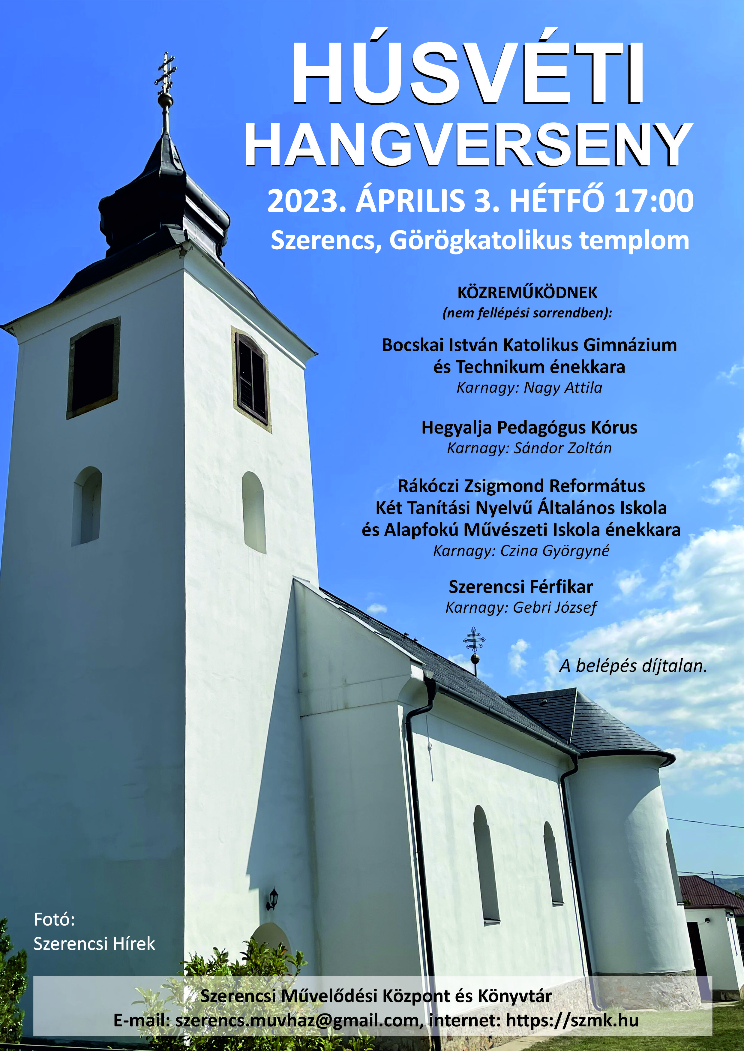 Minden érdeklődőt szeretettel várnak 2023. április 3-án, hétfőn a húsvéti hangversenyre a szerencsi görögkatolikus templomba.