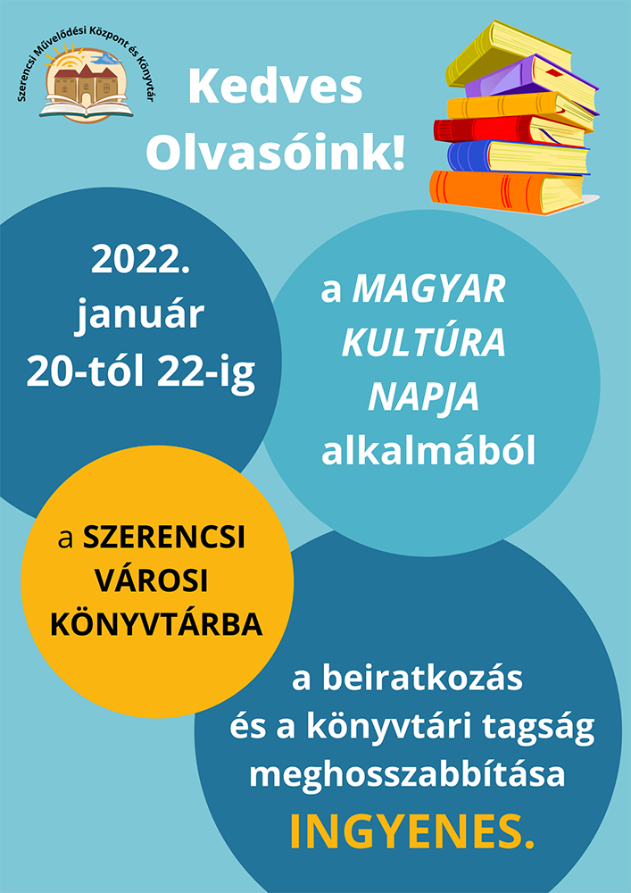 A SZERENCSI VÁROSI KÖNYVTÁR azzal kedveskedik olvasóinak a magyar kultúra napja alkalmából, hogy 2022. január 20-től 22-ig ingyenesen lehet beiratkozni, illetve könyvtári tagságot hosszabbítani. Reméljük, hogy sokan fognak élni ezzel a lehetőséggel és többen olvasnak könyvtárunkban a 2022-es évben!