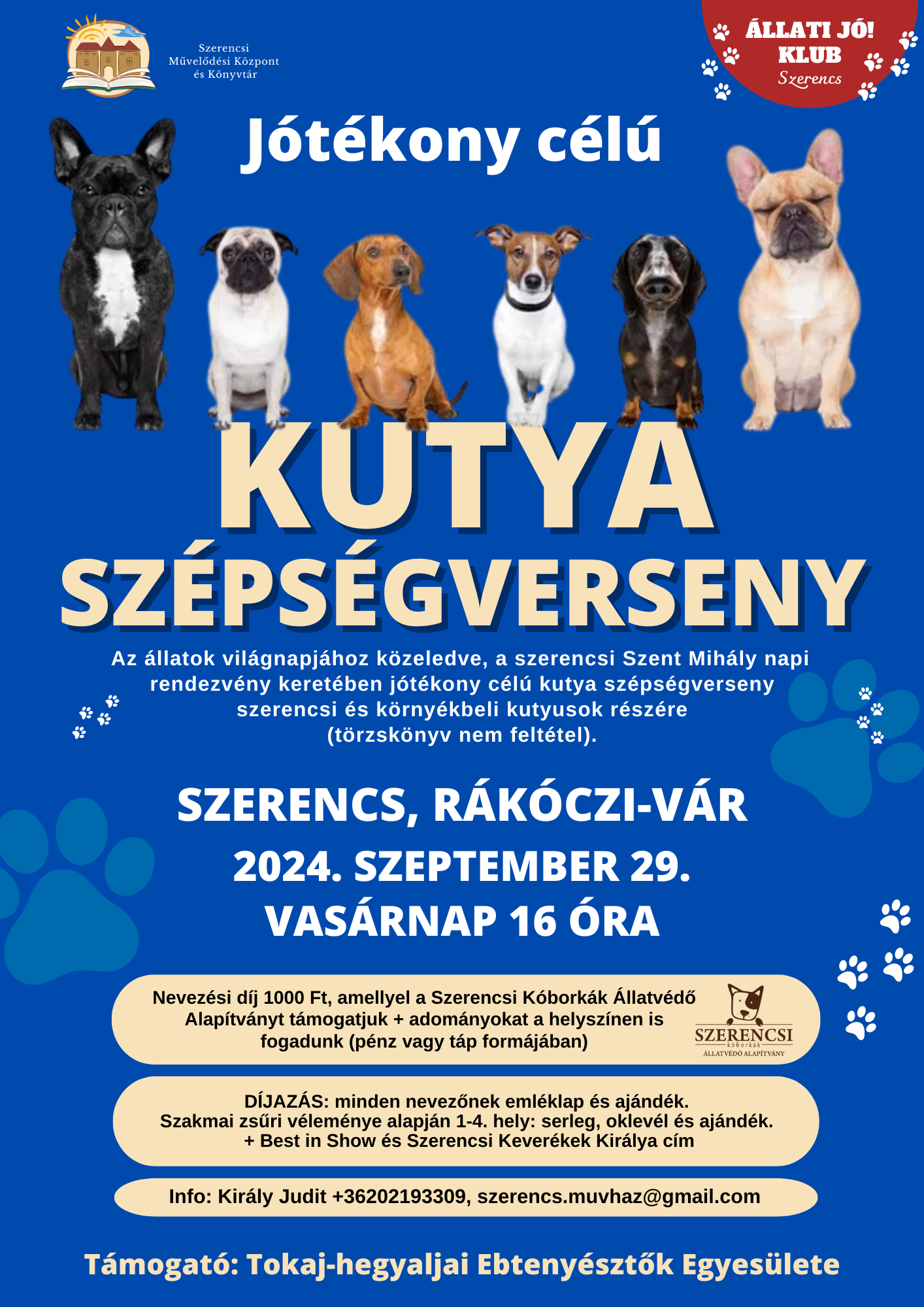 A Szent Mihály napi program keretében, a közelgő állatok világnapja apropóján jótékony célú kutyaszépségversenyt rendeznek a Rákóczi-várban 2024. szeptember 29-én 16 órától. A befolyt nevezési díjakkal a Szerencsi Kóborkák Állatvédő Alapítványt támogatják.