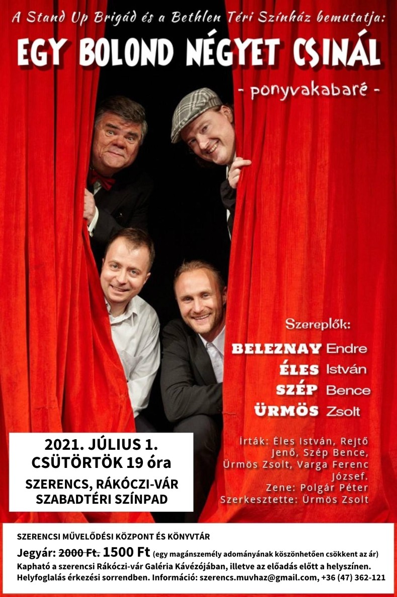 Egy bolond négyet csinál címmel kabaré előadást láthatnak az érdeklődők a szerencsi Rákóczi-vár szabadtéri színpadán 2021. július 1-jén, csütörtökön 19 órától. Egy magánszemély felajánlásának köszönhetően 25%-kal csökken a jegyár, hiszen az eredetileg 2000 forintos belépőt 1500 forintért lehet megvásárolni.