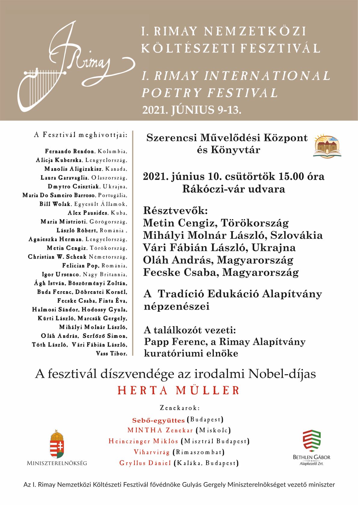 Minden érdeklődőt várnak az I. Rimay Nemzetközi Költészeti Fesztivál szerencsi eseményére 2021. június 10-én, csütörtökön 15 órától a szerencsi Rákóczi-vár Udvaros palotaszárnyában. (Rossz idő esetén a Lovagteremben.) A találkozón részt vesznek magyar, külhoni magyar és külföldi költők. A találkozót vezeti: Papp Ferenc, a Rimay Alapítvány kuratóriumi elnöke.