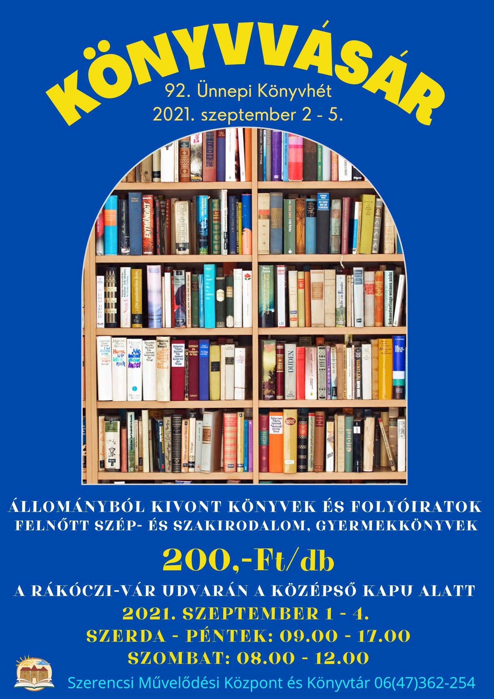 Könyvvásárt rendez a szerencsi városi könyvtár 2021. szeptember 1-4. között, ahol az állományából kivont könyveket, folyóiratokat, magazinokat vásárolhatják meg 200 forintos áron az érdeklődők.Helyszín: Rákóczi-vár udvara, középső kapualj