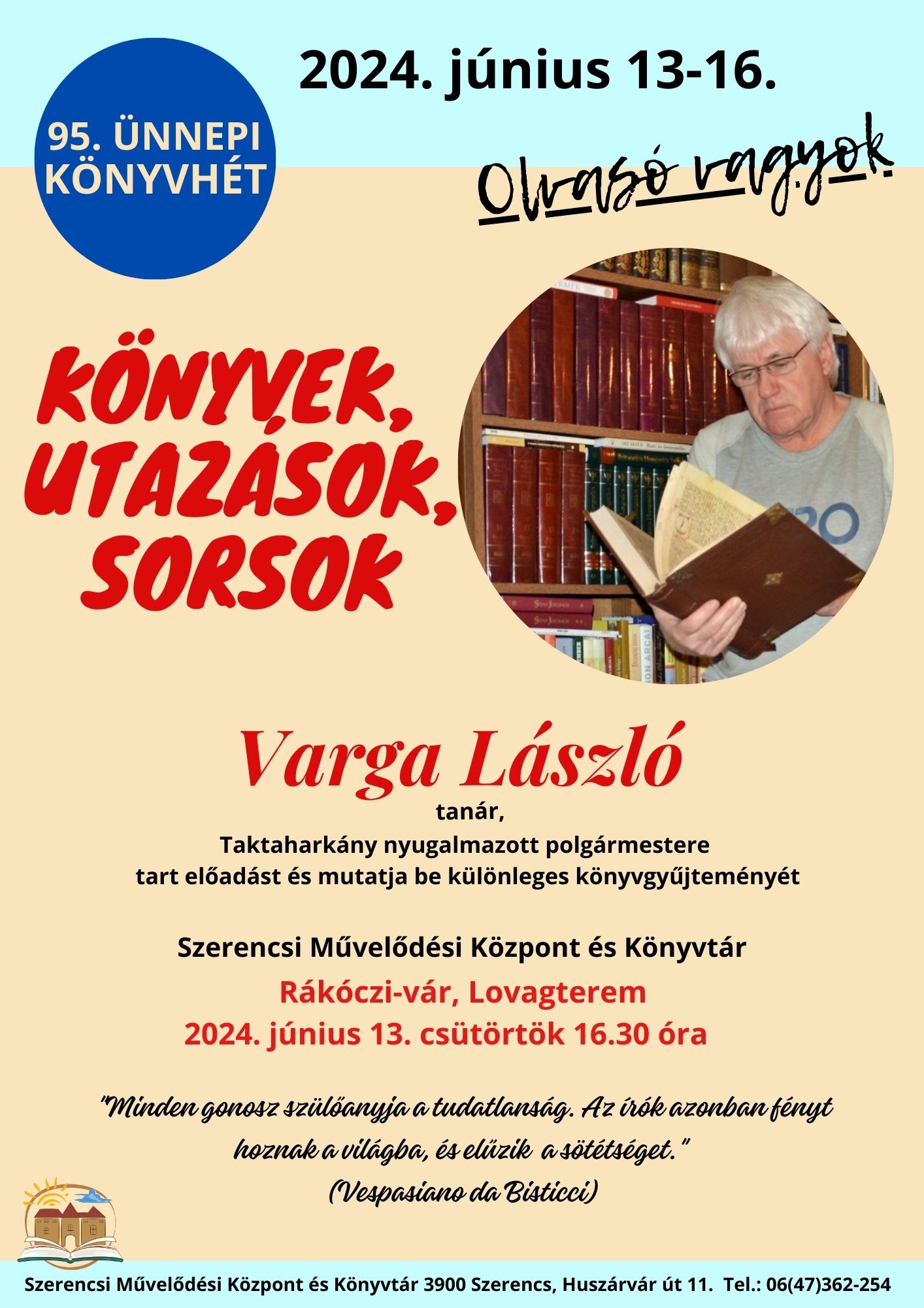 Egy lelkes könyvgyűjtő mutatja be könyvkülönlegességeit az érdeklődőknek az Ünnepi Könyvhét alkalmából 2024. június 13-án 16.30 órakor a Rákóczi-vár Lovagtermében.