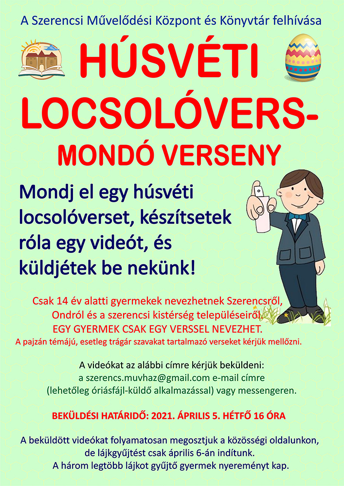 Online húsvéti locsolóvers-mondó versenyt hirdet a Szerencsi Művelődési Központ és Könyvtár. A felhívásra gyerekek által elmondott locsolóversekkel lehet nevezni. A videókat 2021. április 5-én, hétfőn 16 óráig lehet beküldeni.