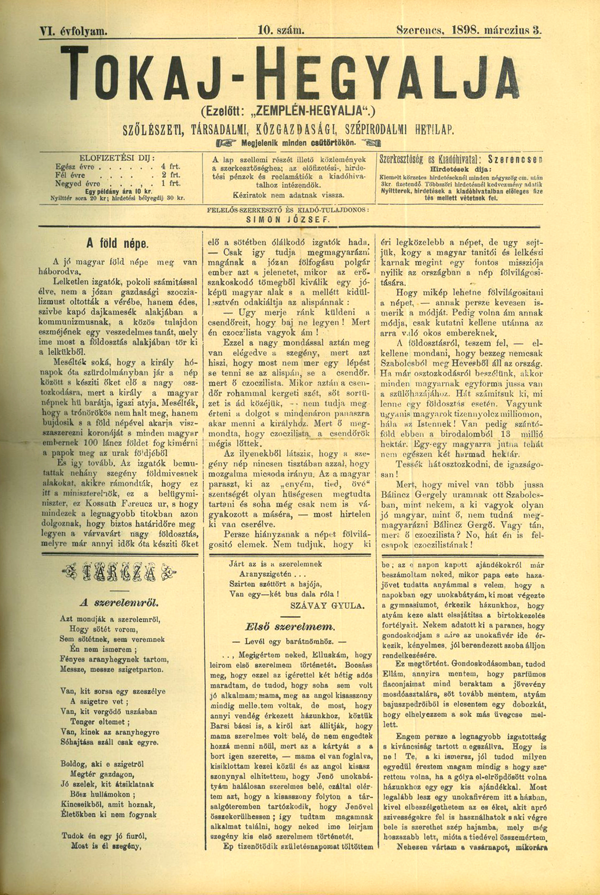 A témánál maradva ezúttal gyűjteményünk más részéből válogattunk; a Szerencsen kiadott Tokaj-Hegyalja 1898. március 3-i számának „Tárcza” rovatában megjelent verset hoztuk Önöknek: