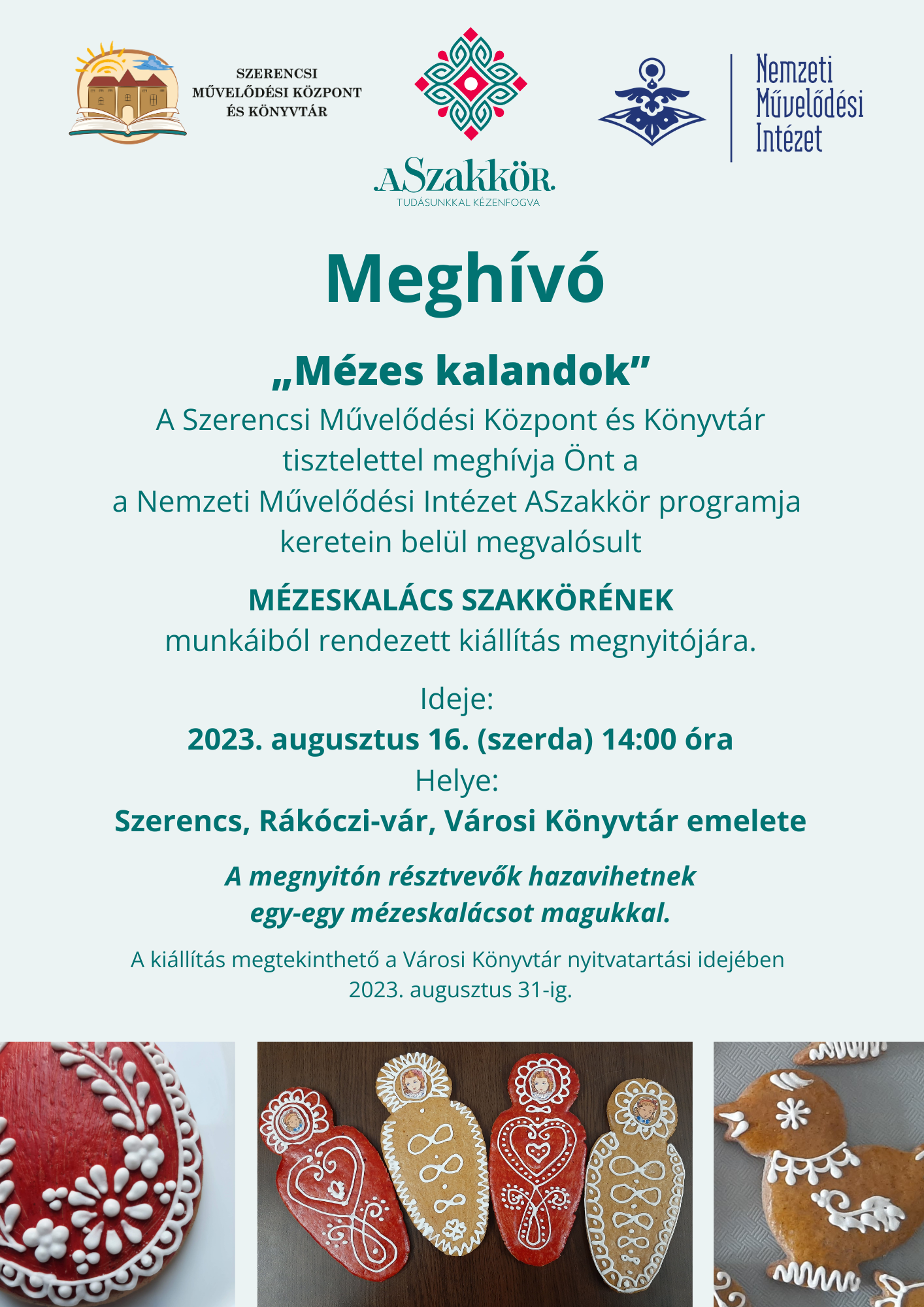 A mézeskalács szakkörön készült alkotásokból nyílik kiállítás 2023. augusztus 16-án, szerdán 14:00 órakor a Városi Könyvtár emeletén, amelynek megnyitójára mindenkit szeretettel várunk.
