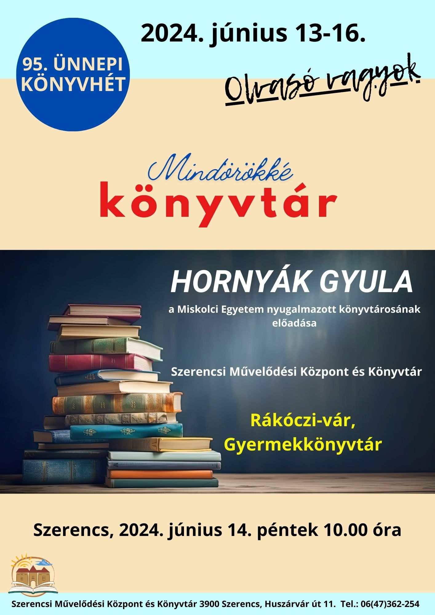 Szerencsi Művelődési Központ és Könyvtár Ünnepi Könyvhéthez kapcsolódó programjai között szerepel Hornyák Gyula, a Miskolci Egyetem nyugalmazott könyvtárosának előadása, melyben többek között híres könyvtárakat mutat be.