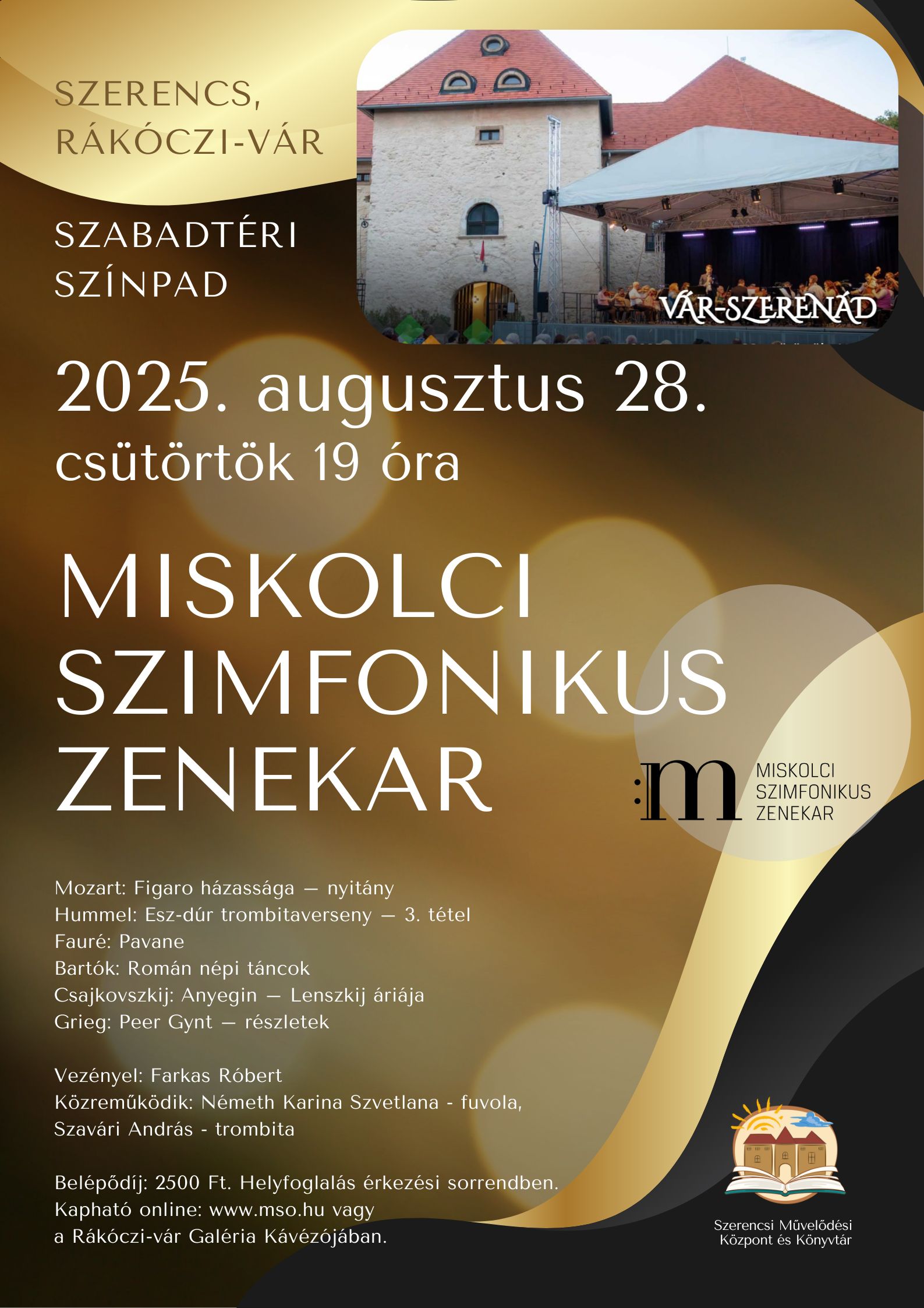 Miskolci Szimfonikus zenekar ad hangversenyt 2025. augusztus 28-án, csütörtökön este 19 órától a szerencsi Rákóczi-vár szabadtéri színpadán.