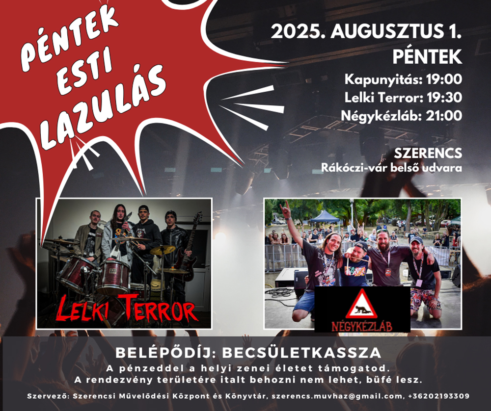 Folytatódik a PÉNTEK ESTI LAZULÁS!Igazi élő zene: blues, rock, metál és egyebek!2025. augusztus 1. péntek 19 óraKét zenekar egy este:– LELKI TERROR– NÉGYKÉZLÁBRákóczi-vár udvaraBelépés díjtalan.