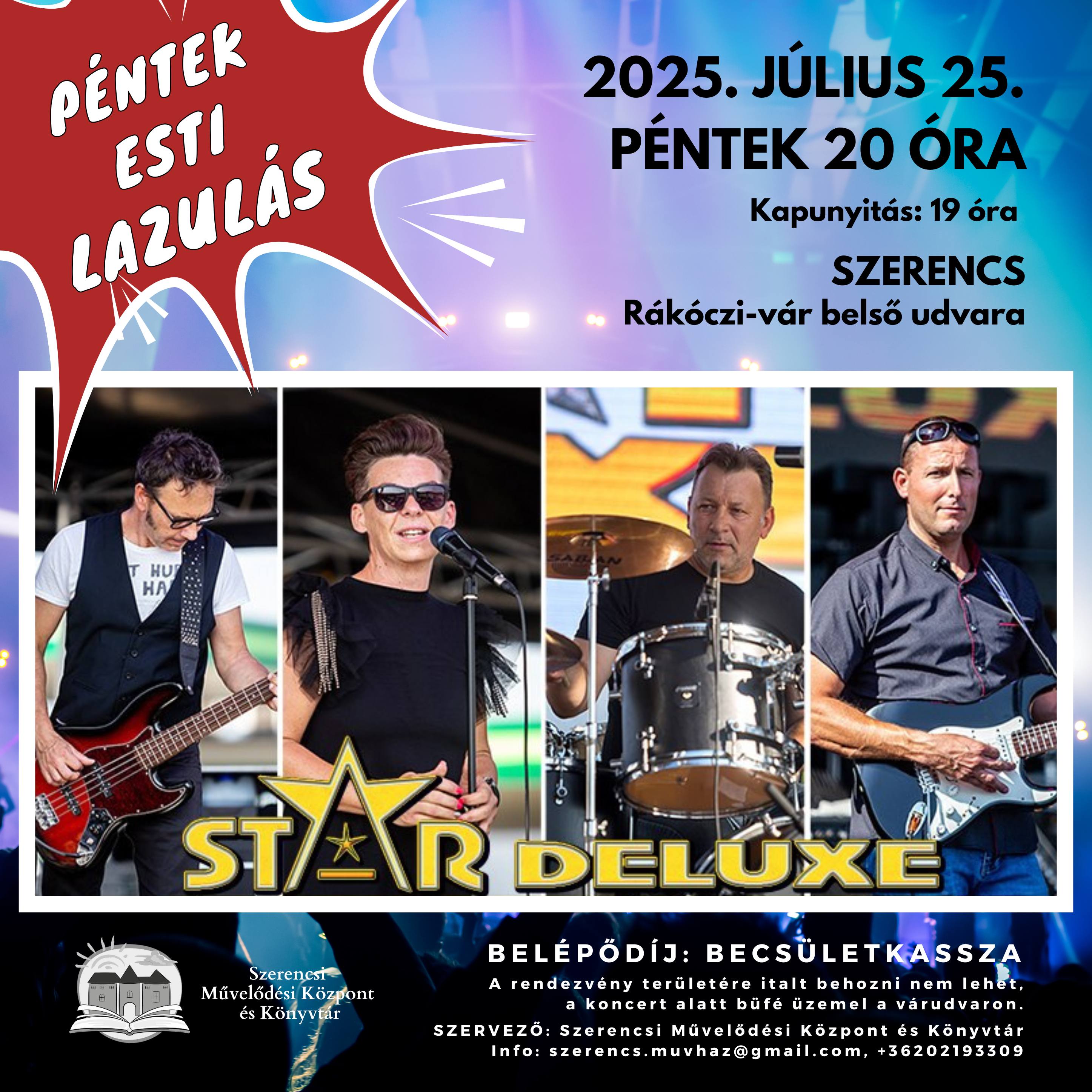 Igazi élő zene: blues, rock, metál és egyebek!!!2025. július 25. péntek 20:00STAR DELUXE zenekarRákóczi-vár udvaraBelépődíj: becsületkassza.