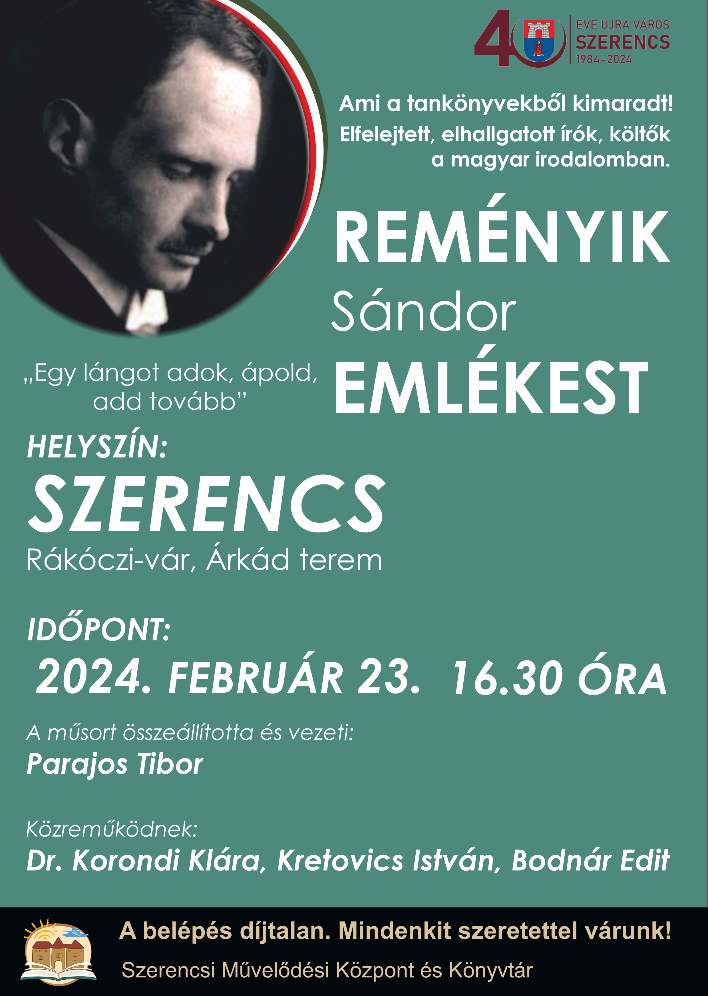 Az első eseményen Reményik Sándor erdélyi költő életművére emlékeznek 2024. február 23-án, pénteken 16:30 órától a Rákóczi-vár Árkád termében.