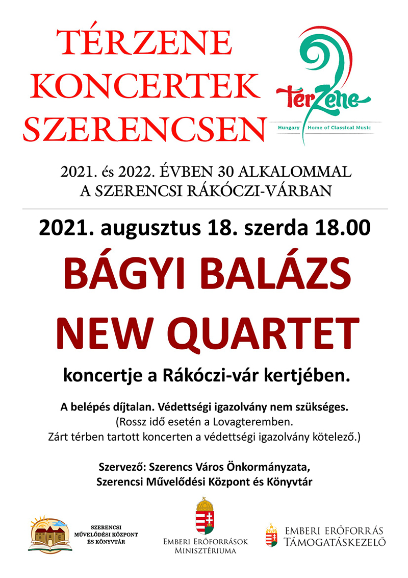 A Bágyi Balázs New Quartet újabb koncertjével folytatódik „Térzene koncertek Szerencsen” programsorozatunk 2021. augusztus 18-án, szerdán 18 órakor.
