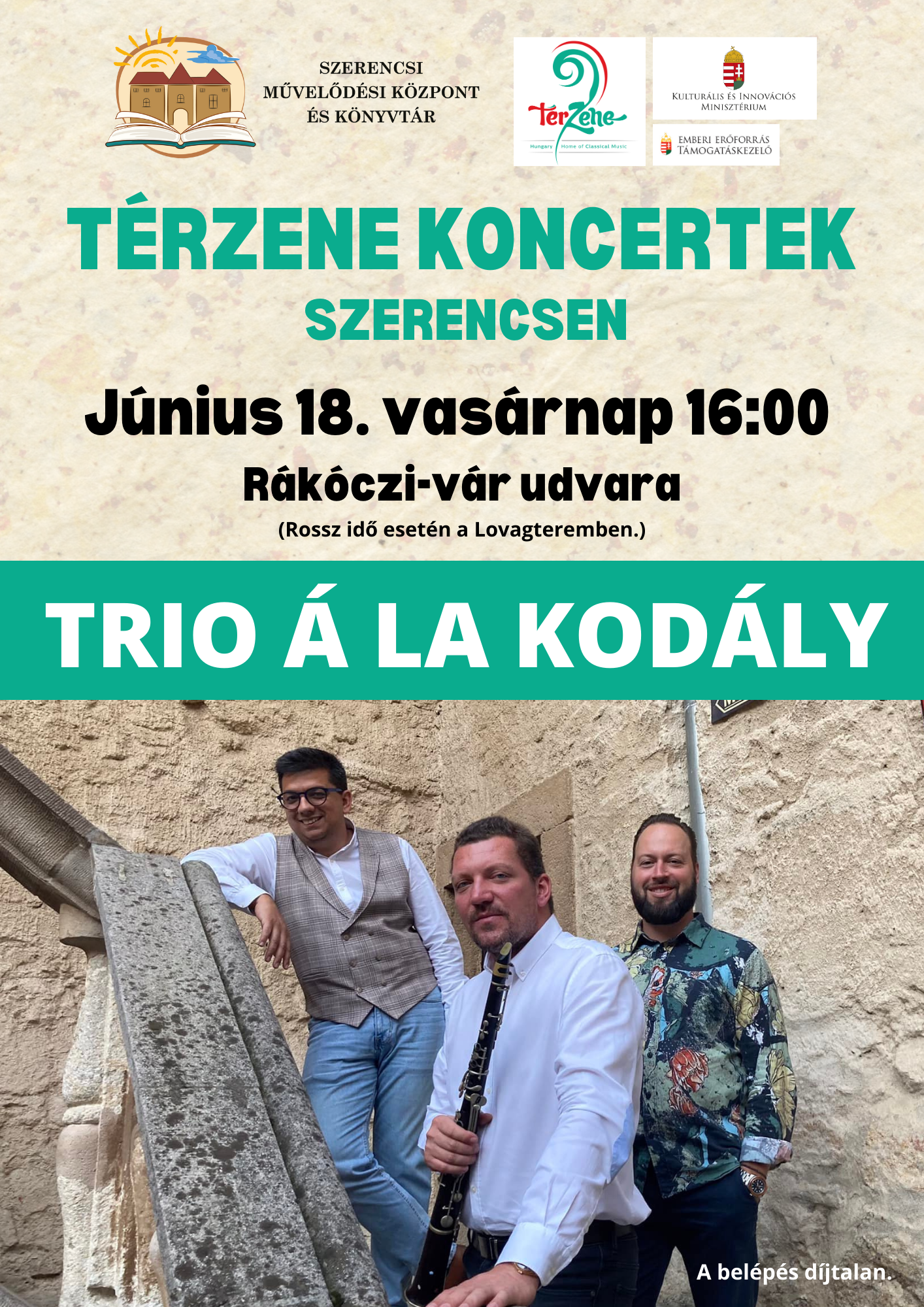 A „Térzene koncertek Szerencsen” sorozatban a szerencsi származású Erdő Zoltán klarinét- és tárogatóművész együttesével a Trio á la Kodállyal ad koncertet 2023. június 18-án, vasárnap 16 órától a Rákóczi-várban udvarán.A belépés díjtalan.