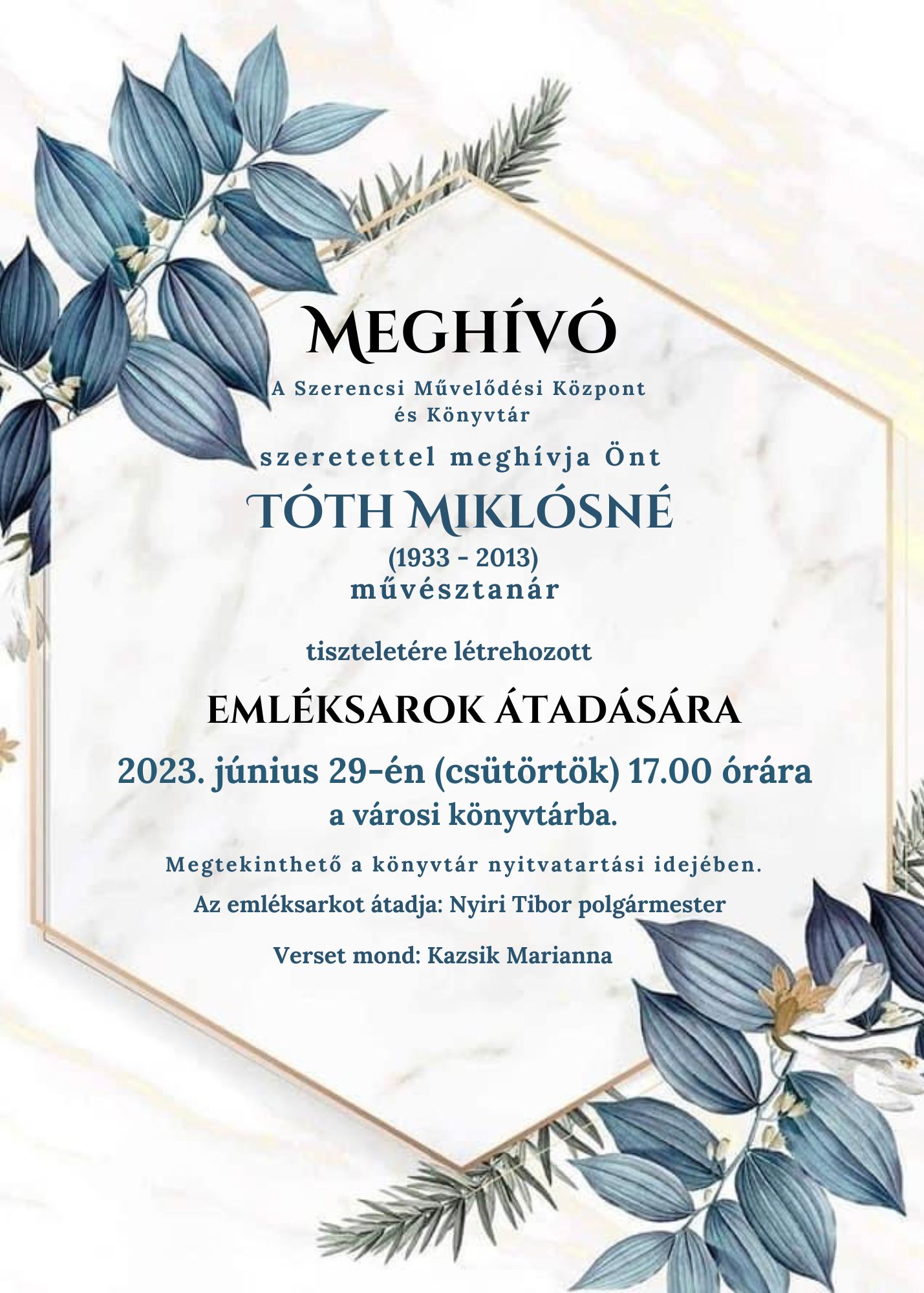 Tíz éve, 2013-ban hunyt el Tóth Miklósné művésztanár, festőművész, aki hosszú éveken át tanított a szerencsi oktatási intézményekben, számos tehetséget segítve a művészi pályára. Mindemellett festőként számos kiállításon, versenyen öregbítette városunk hírnevét. A művész lánya, Szederné Tóth Zsuzsanna által felajánlott dokumentumokat, a Szerencsi Művelődési Központ és Könyvtár, valamint Szerencs Város Önkormányzata tulajdonában álló festményeket, illetve Szegedi Miklósné által a közelmúltban felajánlott alkotásokat felhasználva készült el egy emléksarok a művész emlékére és tiszteletére a városi könyvtárban, amelyet 2023. június 29-én, csütörtökön 17 órakor nyitunk meg.