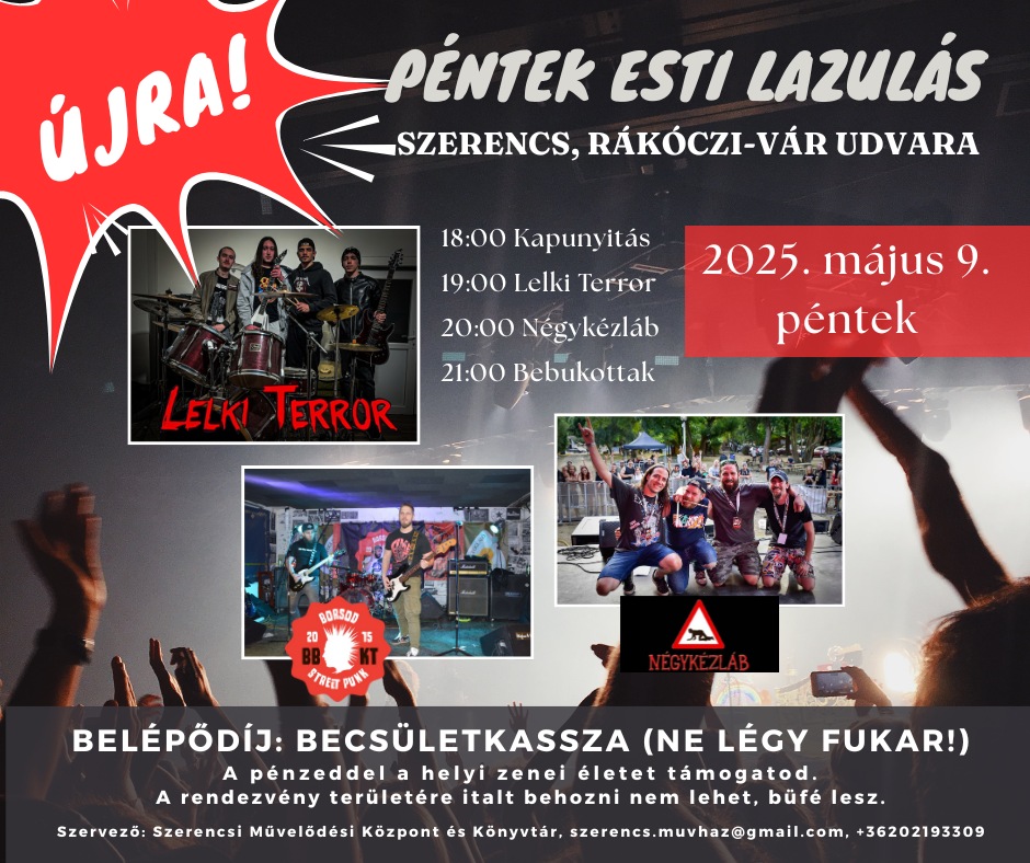 2025. május 9-én, pénteken 19 órától a Rákóczi-vár belső udvarán három zenekar koncertje.19 óra: Lelki Terror20 óra: Négykézláb21 óra: BebukottakA belépés díjtalan: BECSÜLETKASSZA.