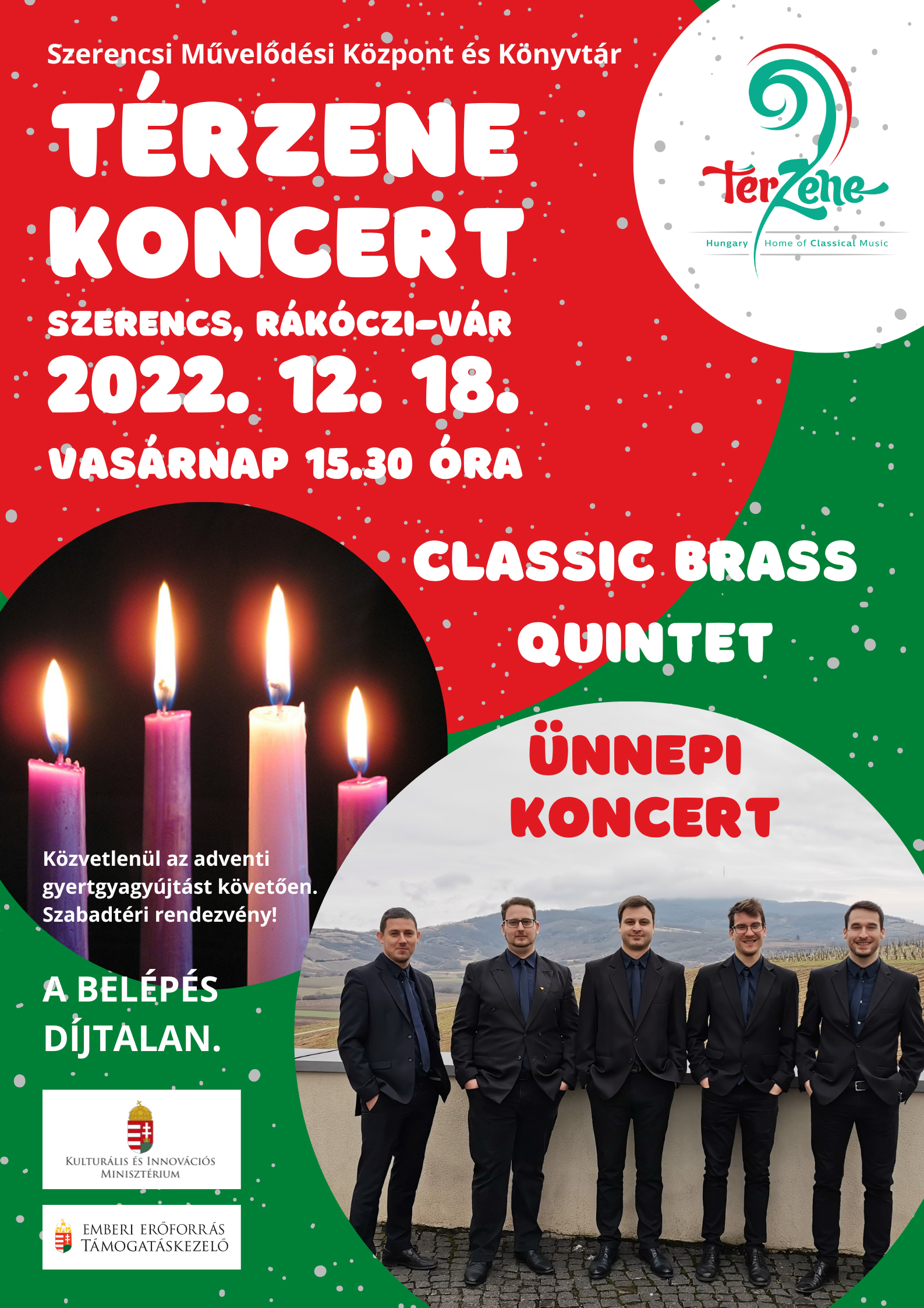 Ünnepi térzene koncert a Classic Brass Quintettel 2022. december 18-án, vasárnap 15.30 órától az adventi gyertyagyújtást követően, a Rákóczi-vár udvarán.