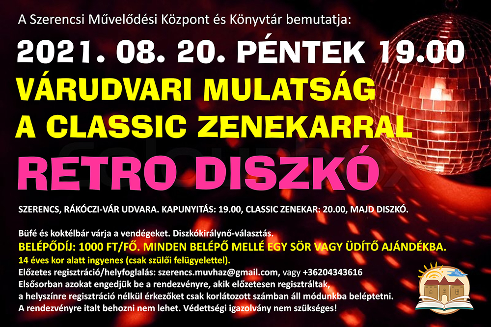 A Szerencsi Művelődési Központ és Könyvtár várudvari mulatságra és retro diszkóra várja az érdeklődőket 2021. augusztus 20-án a Rákóczi-vár udvarán. Zenél a Classic Zenekar.