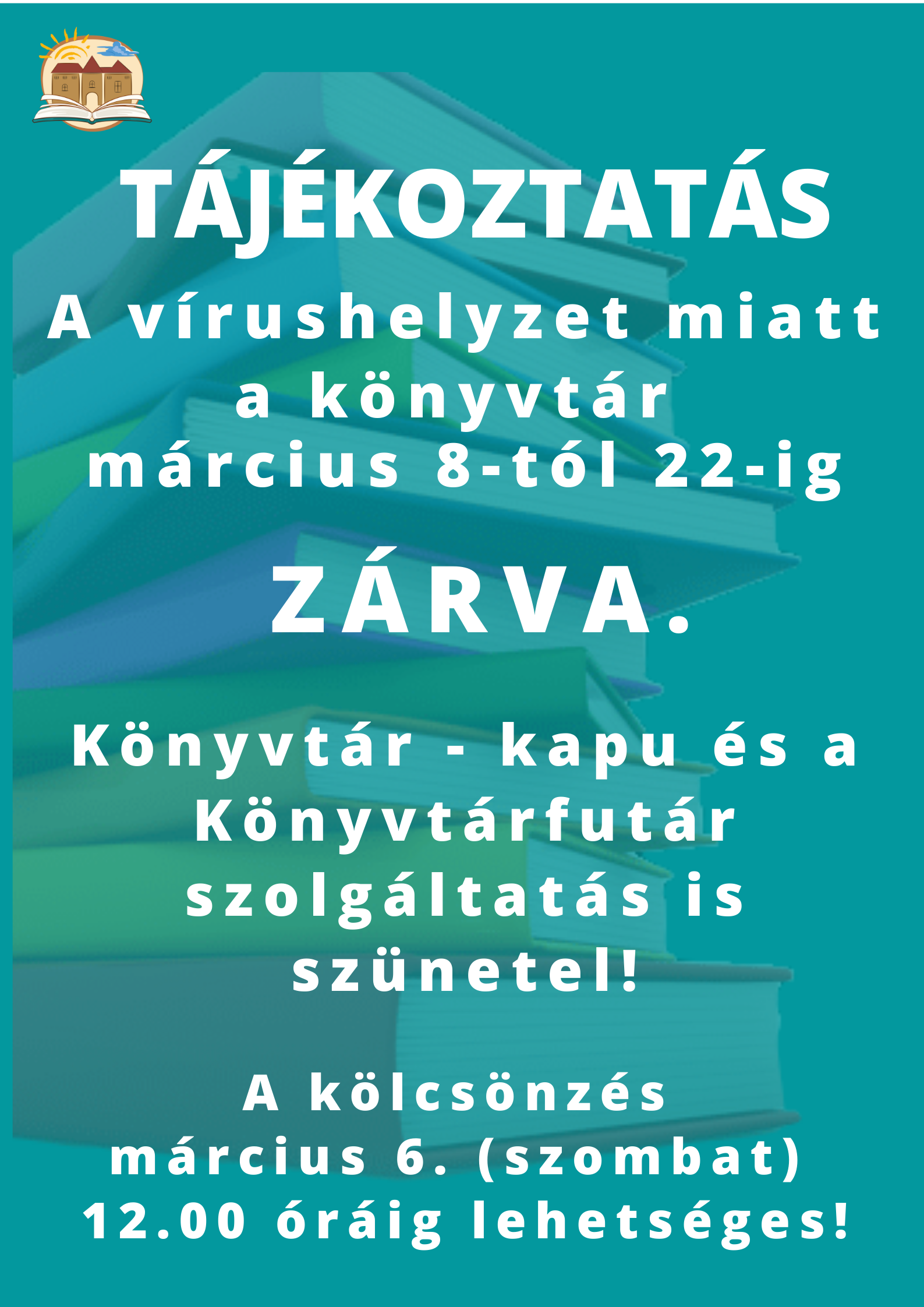 Tájékoztatjuk Önöket, hogy a vírushelyzet miatt a szerencsi könyvtár 2021. március 8-tól 22-ig ZÁRVA tart. Teljes mértékben szünetel a KÖNYVTÁR-KAPU és a KÖNYVTÁRFUTÁR szolgáltatás is. Az előjegyzett könyveket március 6. (szombat) 12 óráig átvehetik.