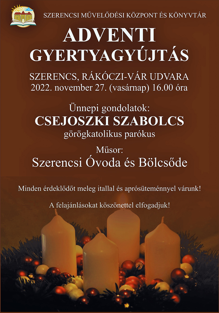 Minden érdeklődőt szeretettel várnak az adventi gyertyagyújtásokra a szerencsi Rákóczi-vár udvarán. Első gyertyagyújtás: 2022. november 27. vasárnap 16 óra