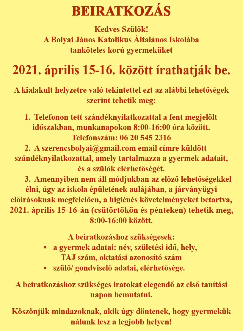 Beíratkozás a Bolyai János Katolikus Általános Iskolába.