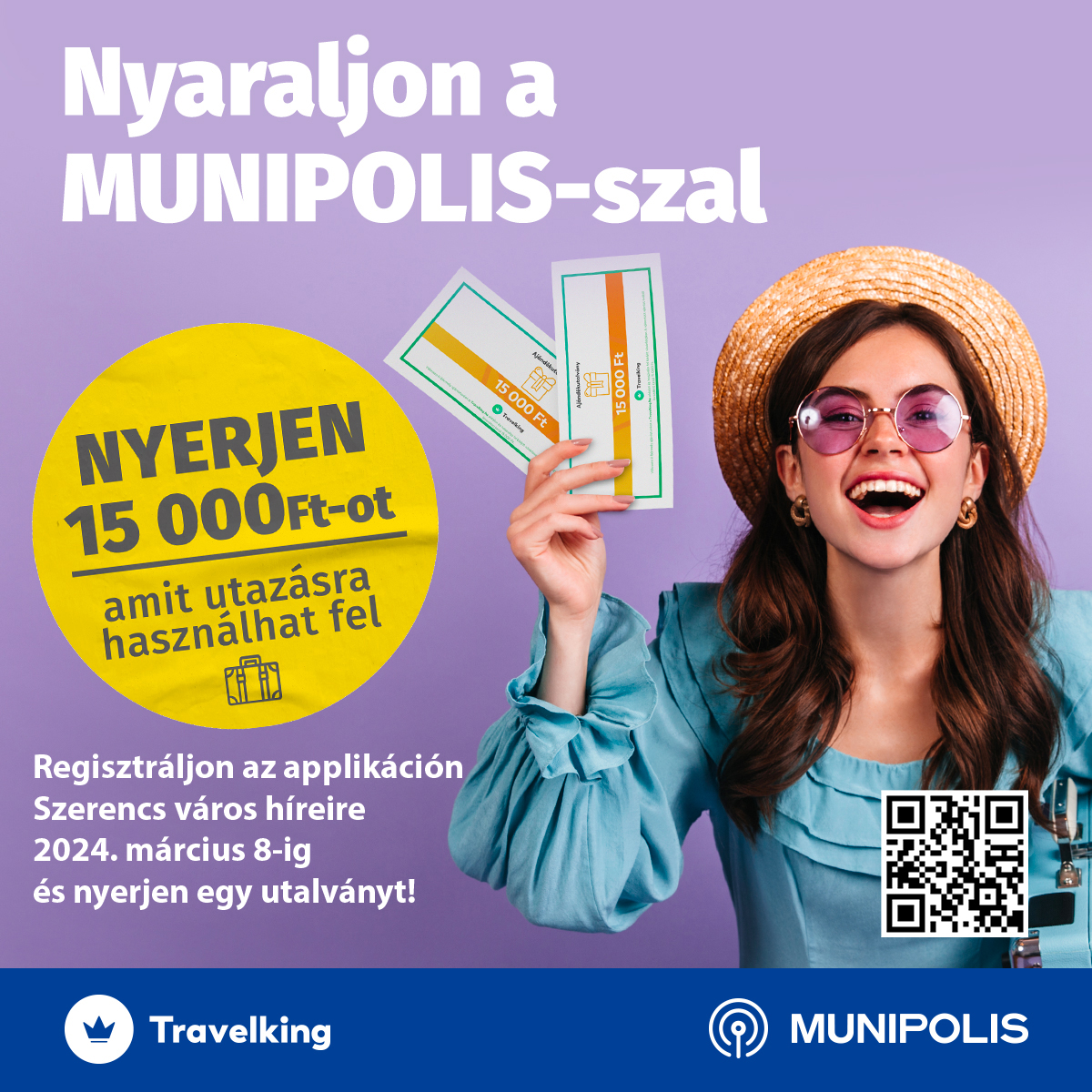 Mindazok közül, akik 2024. március 8-ig regisztrálnak a MUNIPOLIS-on, és feliratkoznak Szerencs város híreire, 50 nyertest sorsolunk ki, akik a Travelking-től 15 000 Ft értékű utalványt kapnak.