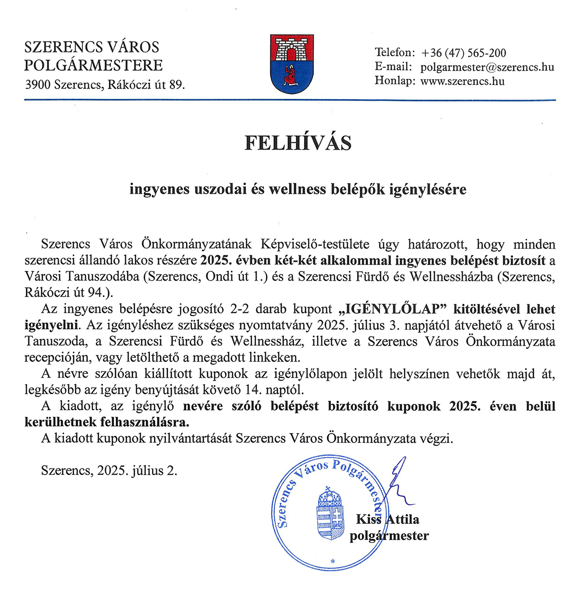 Felhívás ingyenes uszoda és wellnes belépők igénylése