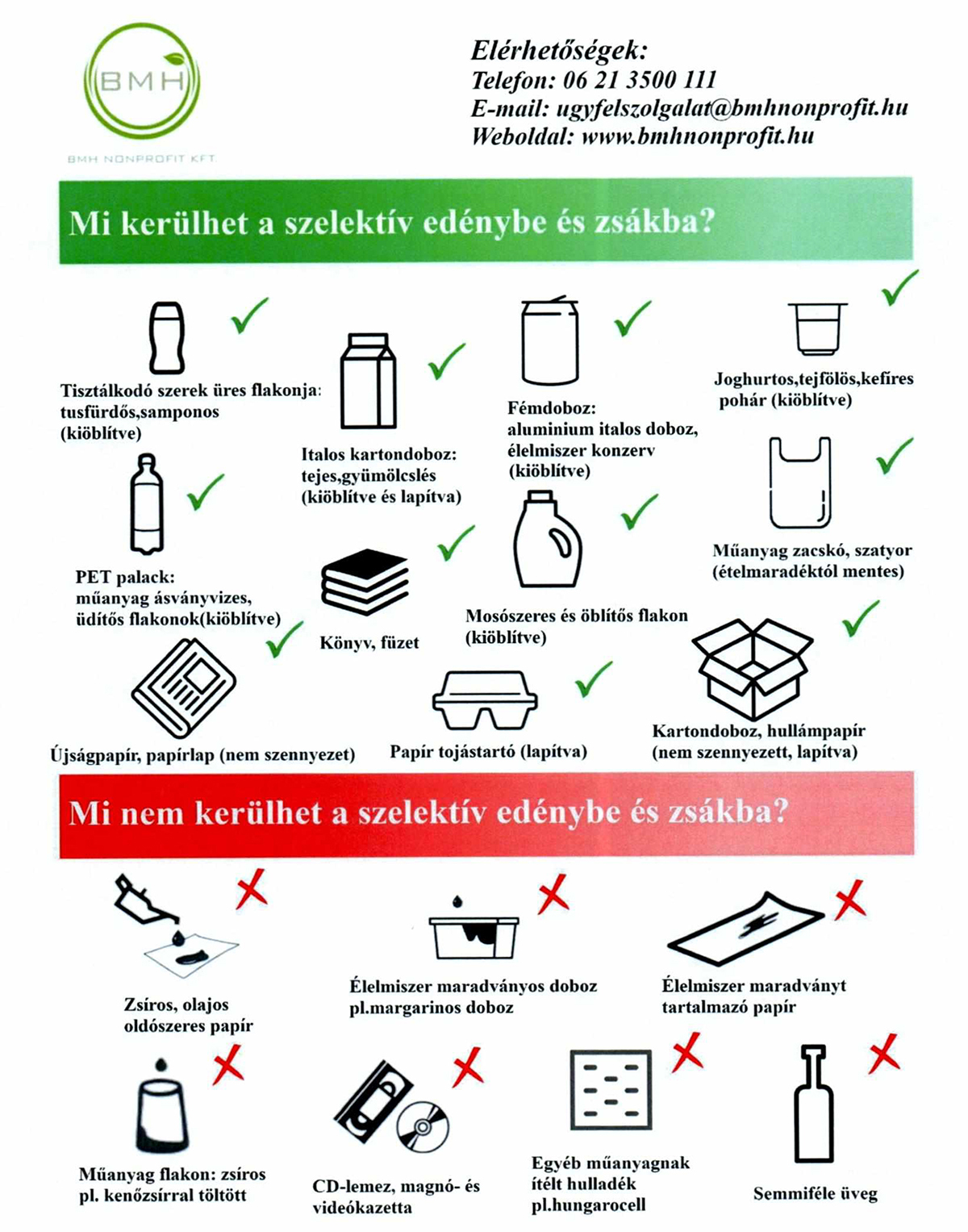 A szelektív hulladékgyűjtő járatunk a település ingatlanhasználói által használt szelektív hulladékgyűjtő edényzetek ürítése kapcsán az edényzetek nagyfokú szennyezettségét jelezte, melynek következtében bizonyos esetekben a hulladék elszállítása is lehetetlenné vált. A szelektív hulladékgyűjtő edényzetek több esetben az edényzetbe nem helyezhető, újrahasznosításra alkalmatlan hulladékot pl. nikecellt, műanyag virágcserepet és vödröket, egyéb használati tárgyakat, elektronikai hulladékot, festékes vödröt (kirívó esetben akár állati tetemet is) tartalmaznak.