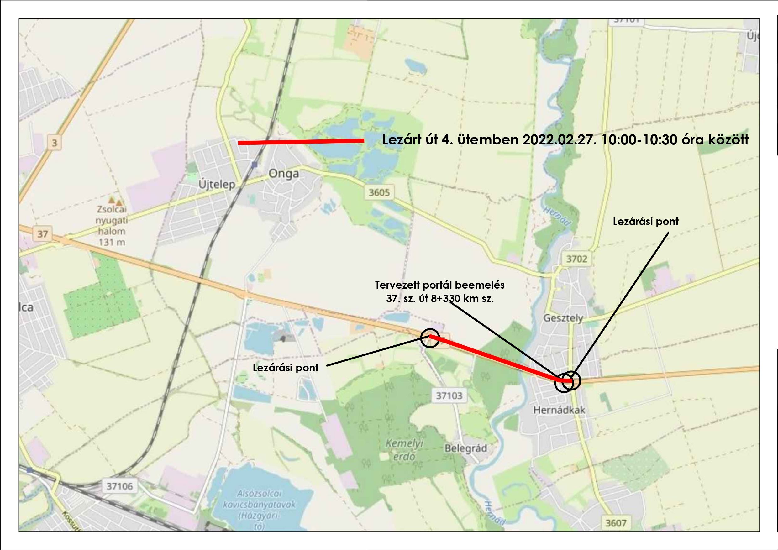 4. ütem: 8+330 km sz. teljes keresztmetszetét le kell zárni. A lezárást az illetékes rendőrhatóság biztosítja. A teljes lezárás az ÉRV-s jelzőlámpás csomópont és a Gesztely-Hernádkak meglévő körforgalmú csomópont közötti szakaszon 10-10:30 óráig tart, ezalatt a portálszerkezet gerenda beemelése és összeszerelése megtörténik.