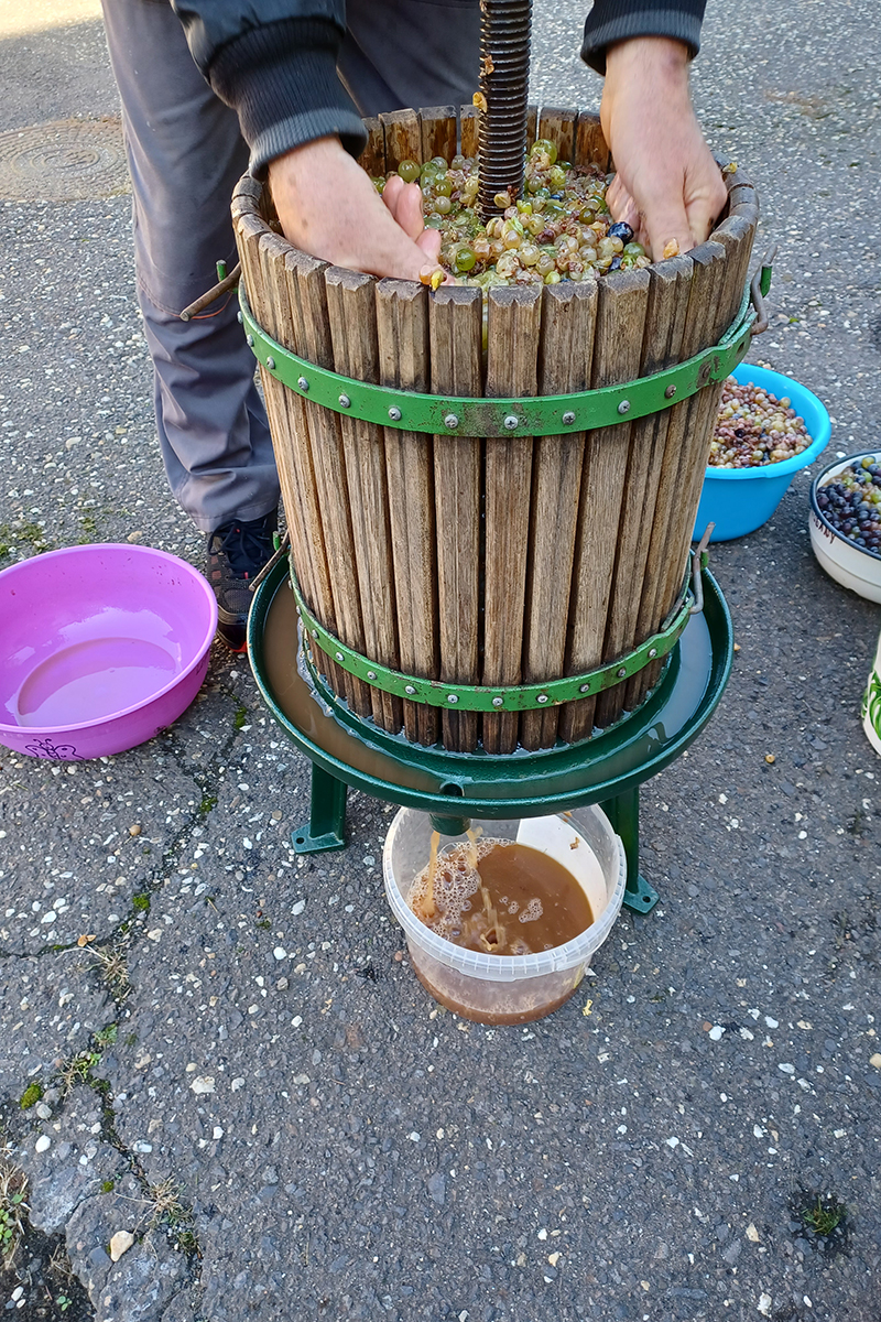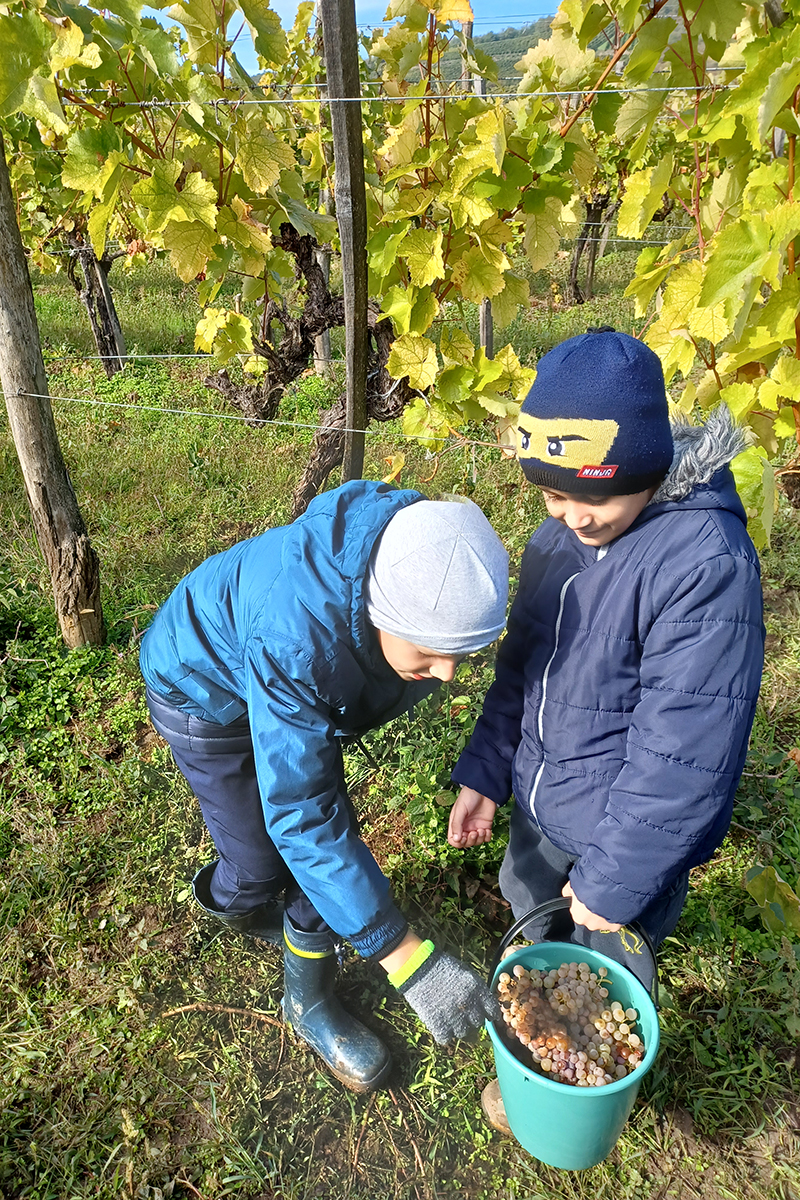 Másnap reggel a kisebbek is szorgalmasan szemezgették a fürtöket. Préselés után nagyon finom, édes mustot nyertünk a szüretelt szőlőből.