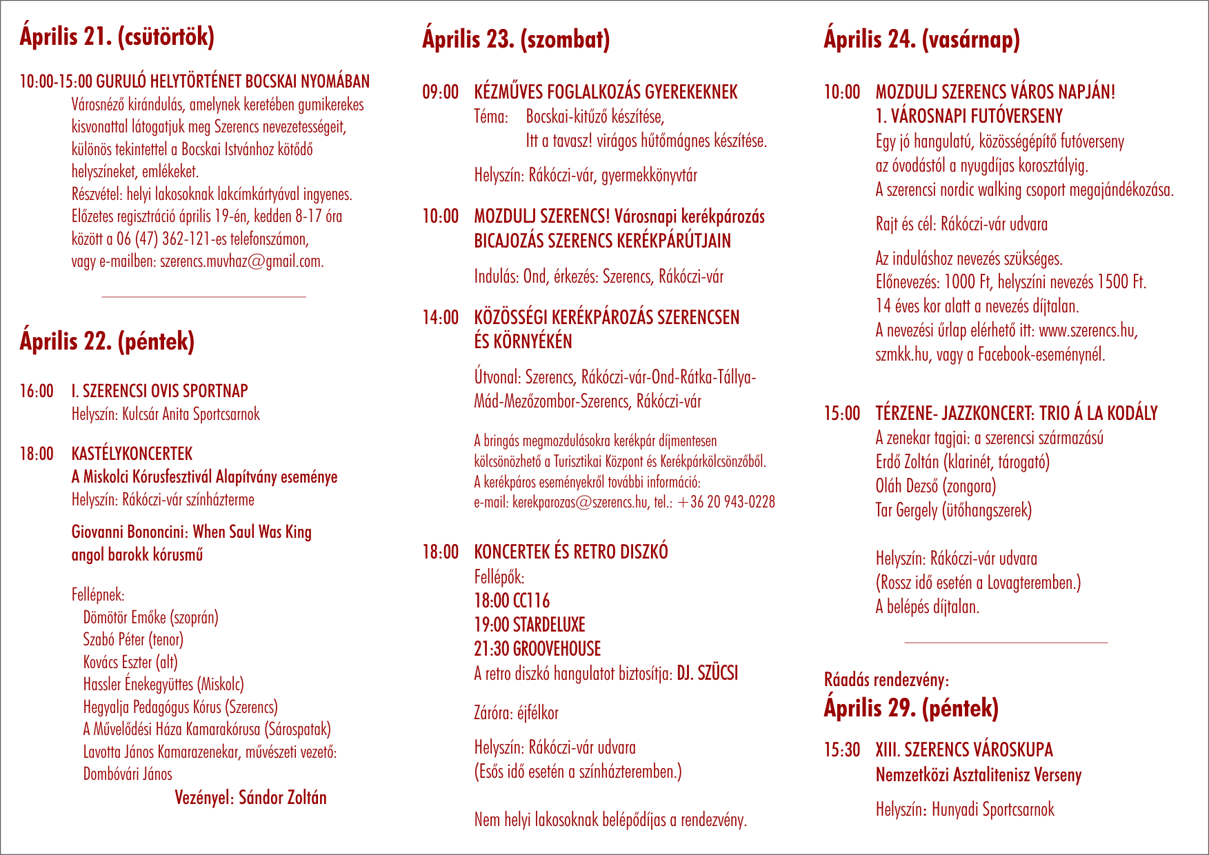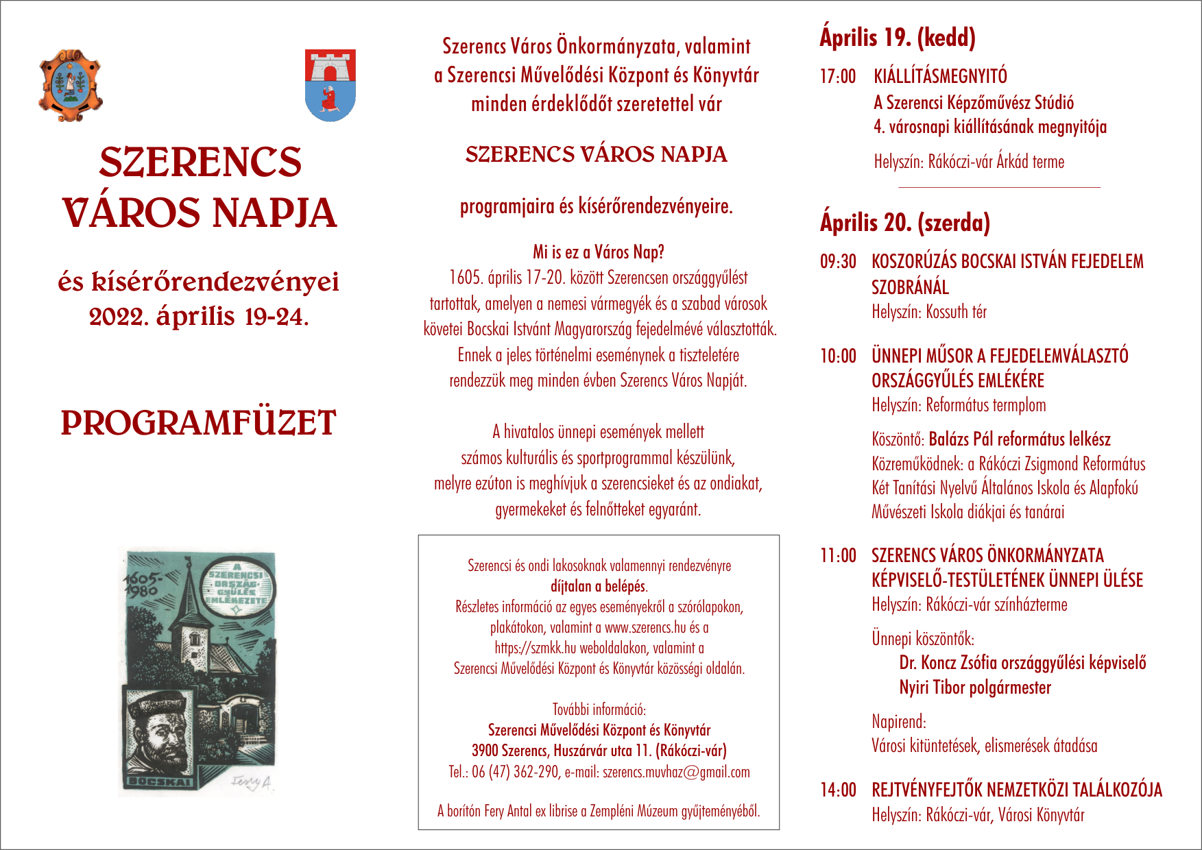 Szerencs Város Önkormányzata minden érdeklődőt szeretettel vár a 2022. évi Szerencs Város Napja ünnepi programjaira és kísérőrendezvényeire.A Szerencs Város Napja programsorozat részletes programfüzete az alábbiakban olvasható.