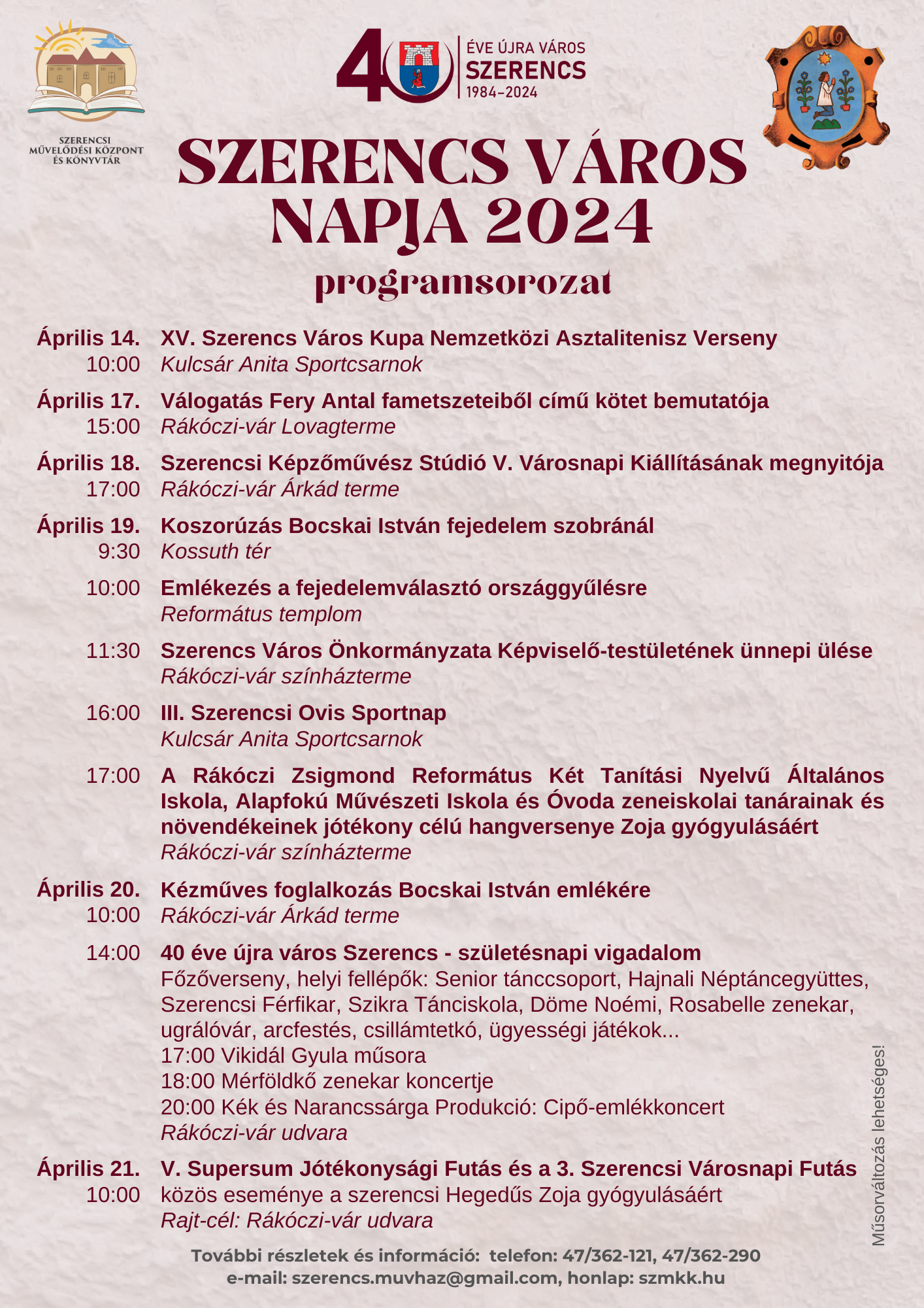A 1605-ös Bocskai-országgyűlésre emlékező Szerencs Város Napja mellett idén az újbóli várossá nyilvánításának 40. évfordulóját is ünnepli Szerencs.