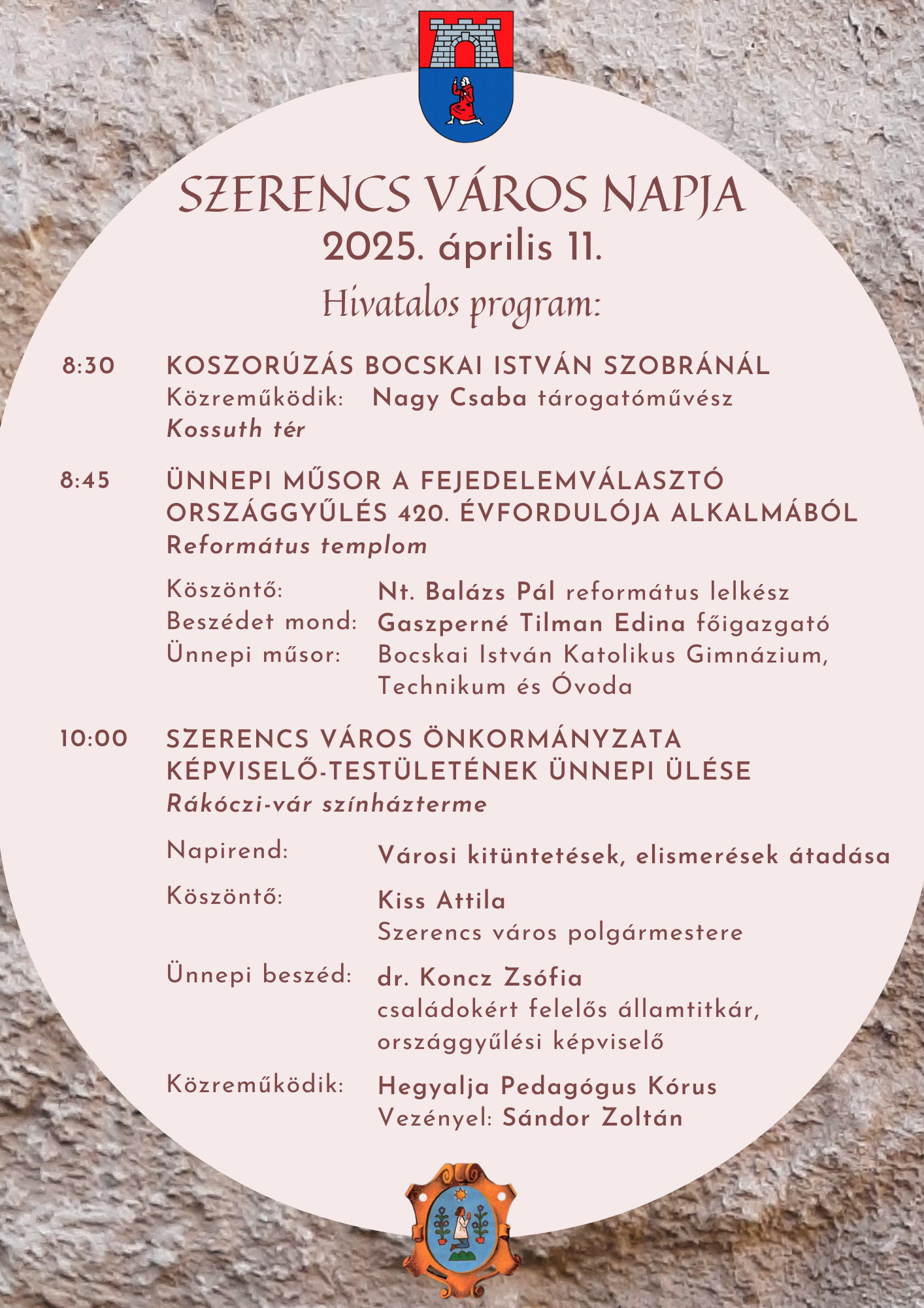 Szerencs Város Önkormányzata 2025. április 11-én, pénteken rendezi meg a Szerencs Város Napja programot, melynek keretében 8.30 órától koszorúzást rendeznek Bocskai István szobránál a Kossuth téren.