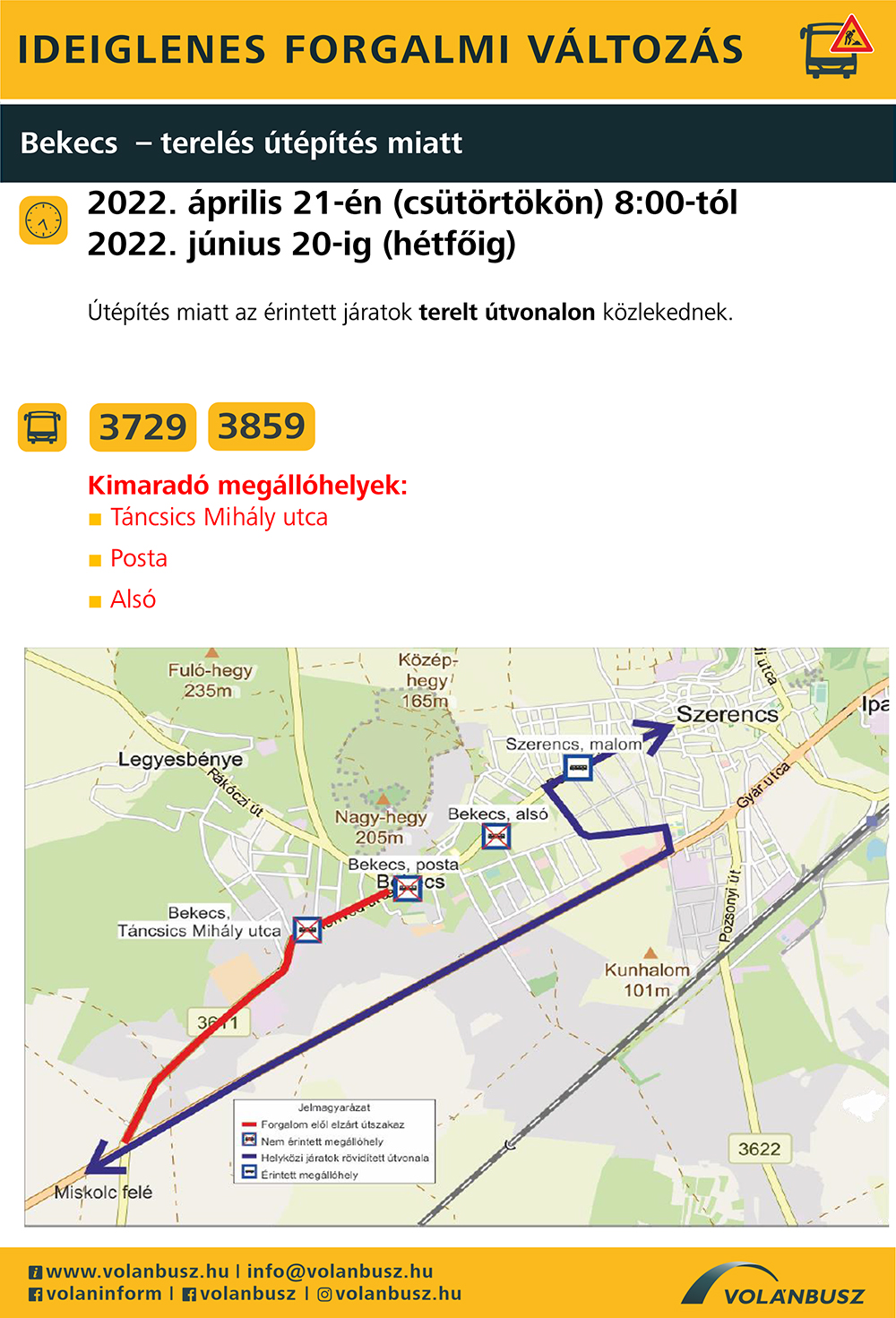 A harminchetes négysávosítása miatt április 21-től nem lehet felhajtani Bekecs irányából a főútra (és lehajtani sem ebbe az irányba), ezért egyes járatoknál 2022. június 20-ig kimaradnak a községben megállóhelyek (Táncsics Mihály utca, Posta, Bekecs alsó). Az autóbuszok Szerencsen a Malom megállóhelytől a – Vörösmarty utca – Csalogány utca – MOL-kút terelt útvonalon közlekednek, ahol ezért több helyen Megállni tilos! jelzőtáblák kerültek kihelyezésre. A forgalmi rend ideiglenes változtatása miatti kellemetlenségért a VOLÁNBUSZ kéri az utazók megértését és gépjárművezetők fokozott figyelmét.