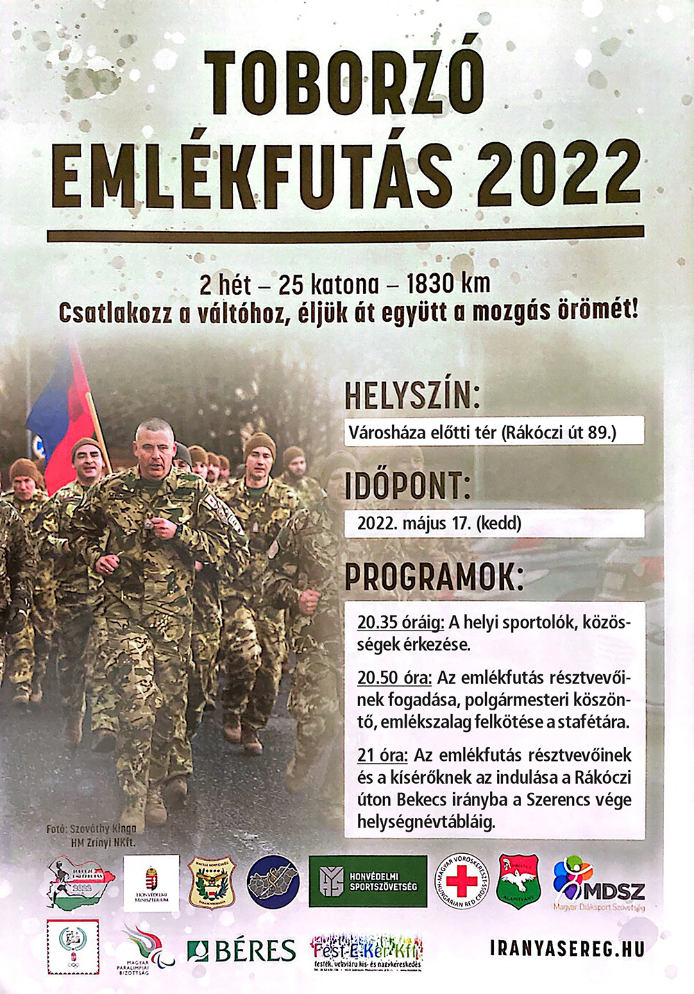 Az Adrianus Alapítvány a Falvak Kultúrájáért, a Katonaolimpikonok Baráti Kör és a Magyar Honvédség 2022. május 6-20. között rendezi meg a „Toborzó Emlékfutás 2022” elnevezésű programsorozatot. Az eseményen hivatásos, szerződéses és önkéntes tartalékos katonák váltófutást teljesítenek az ország 219 települését érintve.