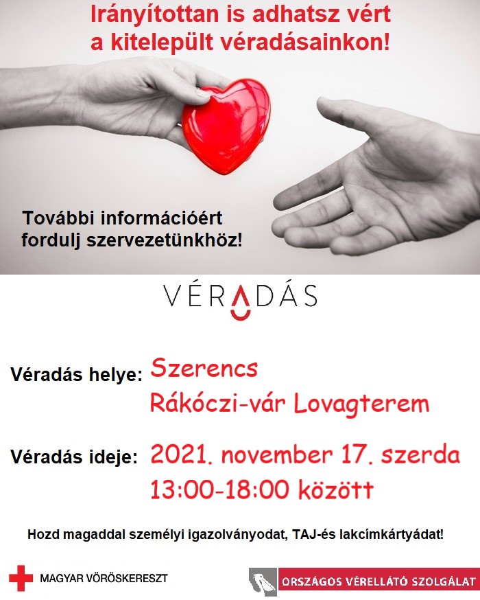 A Magyar Vöröskereszt véradást szervez Szerencsen 2021. november 17-én, szerdán 13 órától a Rákóczi-várban.